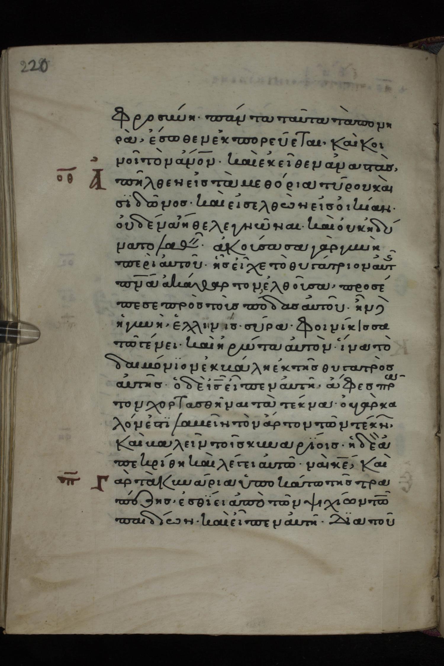 Twelfth century minuscule of the Gospels on parchment; 285 leaves, 1 column, 21-23 lines per column. Images were taken at the National Library of Greece in Athens.