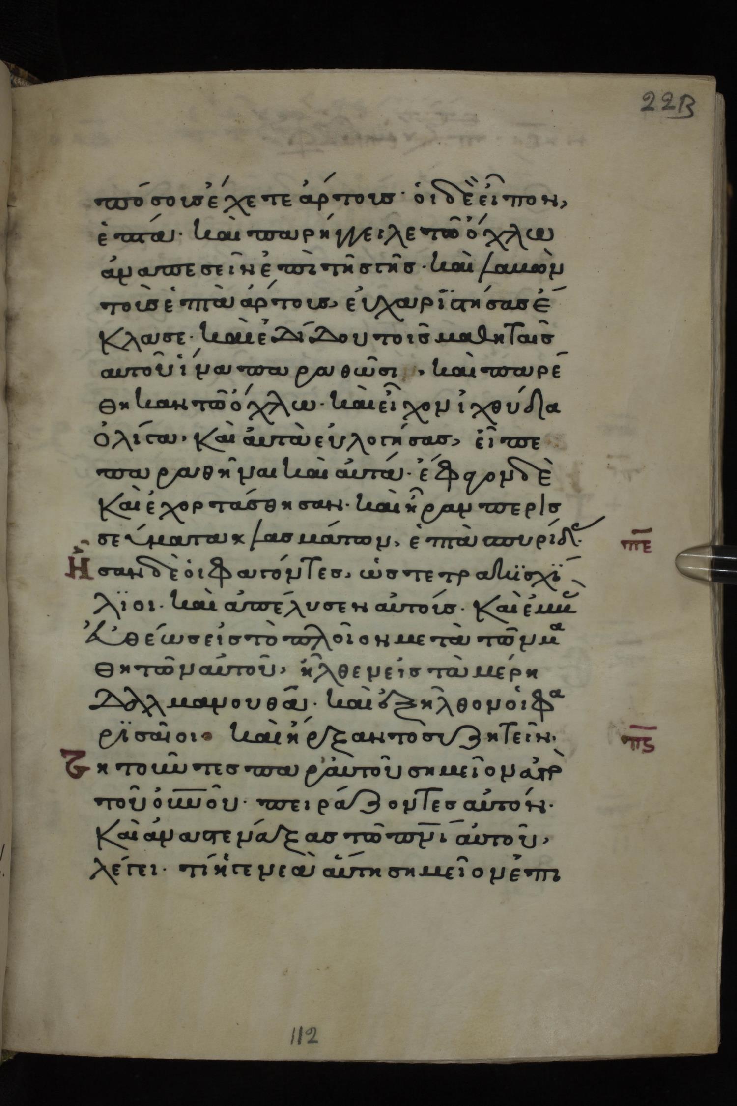 Twelfth century minuscule of the Gospels on parchment; 285 leaves, 1 column, 21-23 lines per column. Images were taken at the National Library of Greece in Athens.