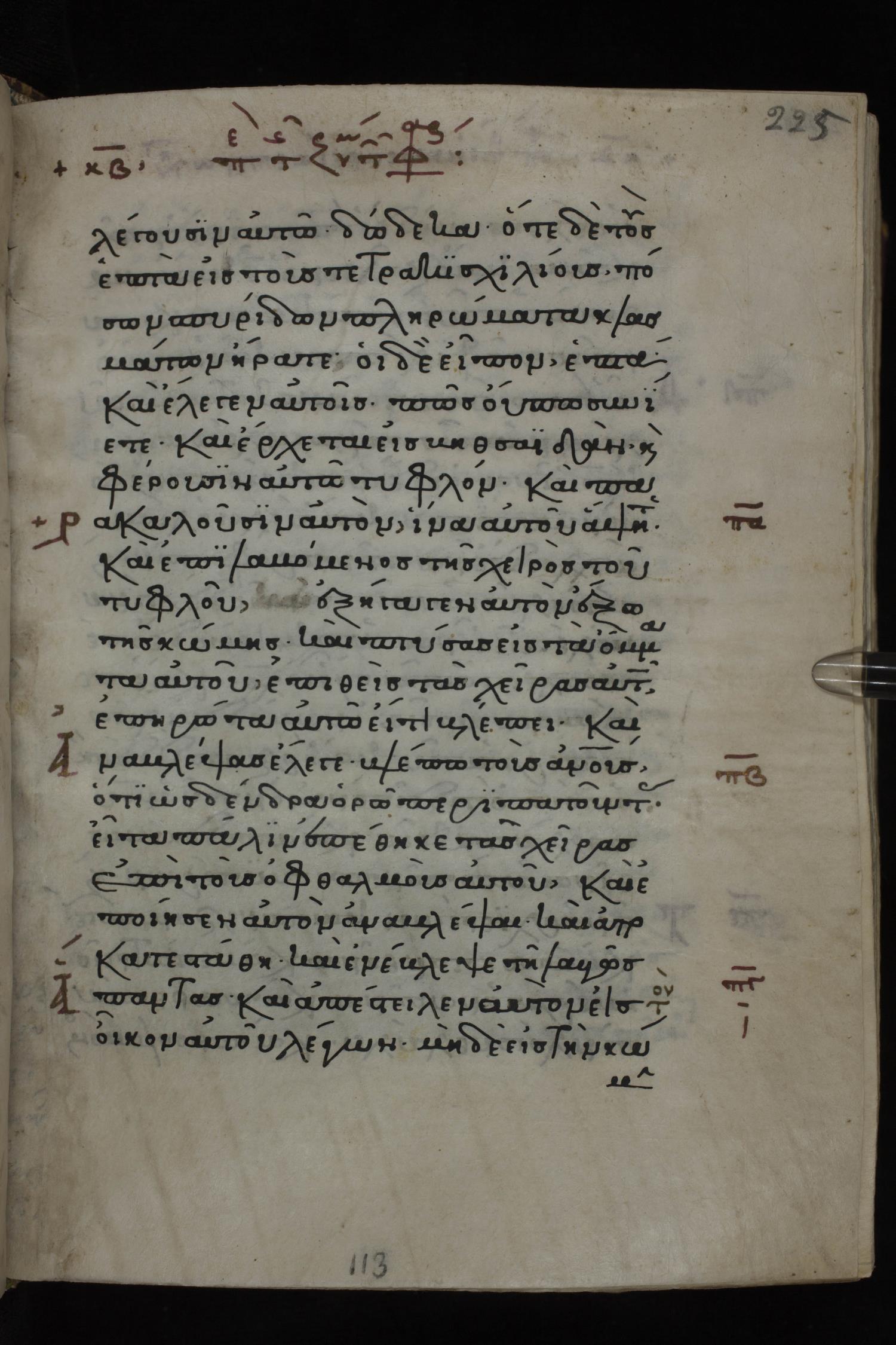 Twelfth century minuscule of the Gospels on parchment; 285 leaves, 1 column, 21-23 lines per column. Images were taken at the National Library of Greece in Athens.