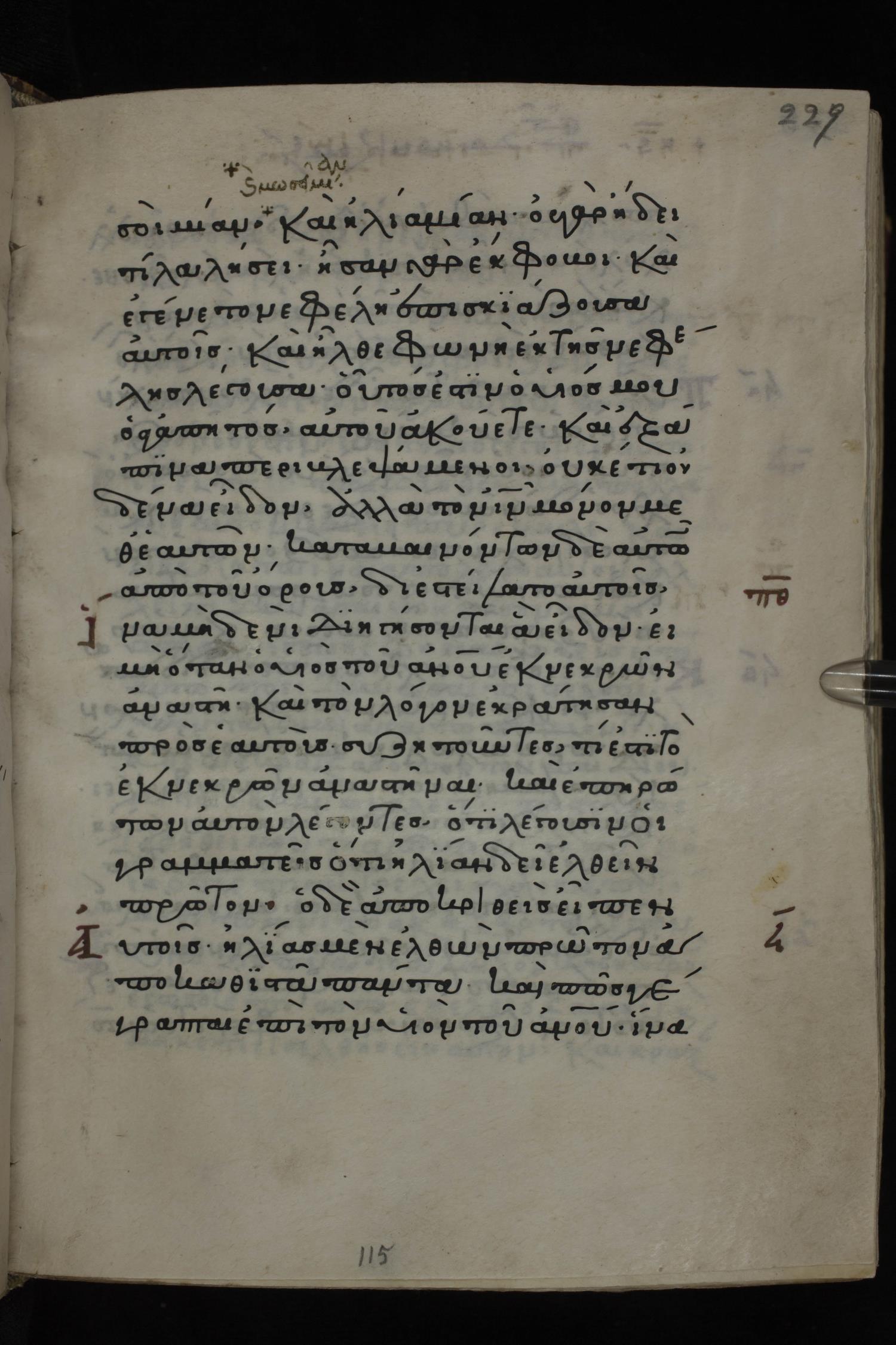 Twelfth century minuscule of the Gospels on parchment; 285 leaves, 1 column, 21-23 lines per column. Images were taken at the National Library of Greece in Athens.