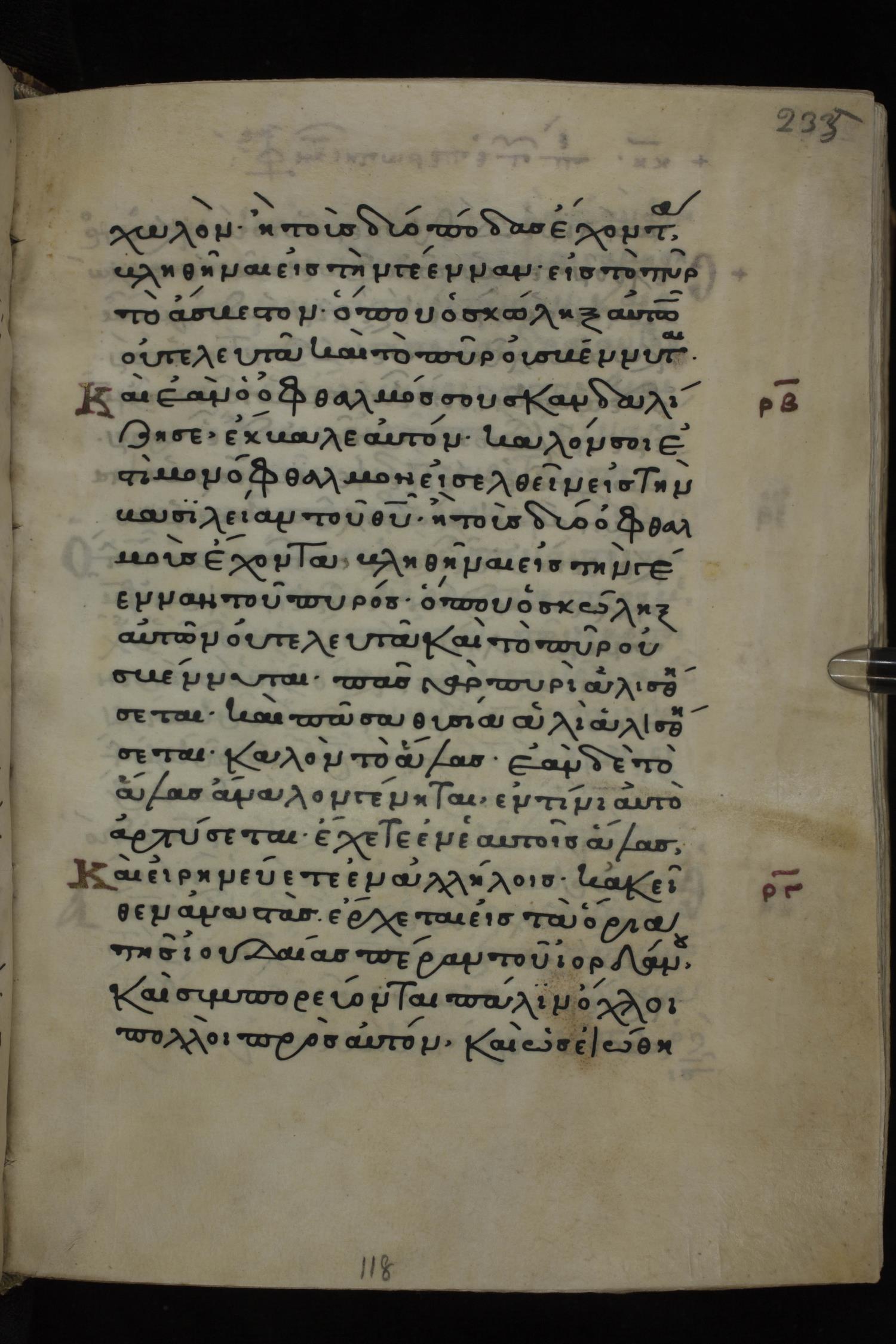 Twelfth century minuscule of the Gospels on parchment; 285 leaves, 1 column, 21-23 lines per column. Images were taken at the National Library of Greece in Athens.