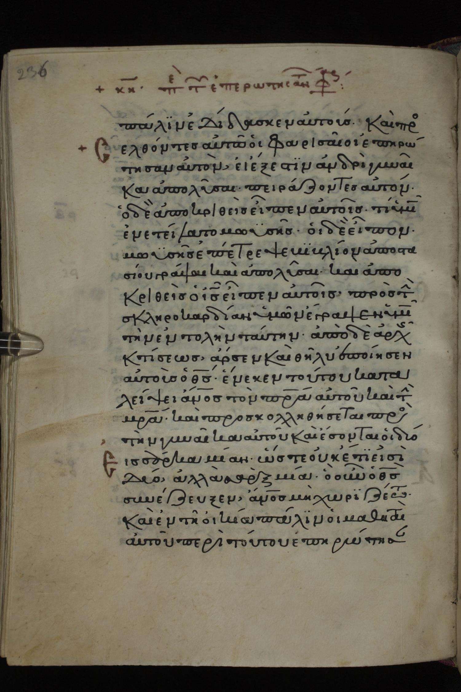 Twelfth century minuscule of the Gospels on parchment; 285 leaves, 1 column, 21-23 lines per column. Images were taken at the National Library of Greece in Athens.