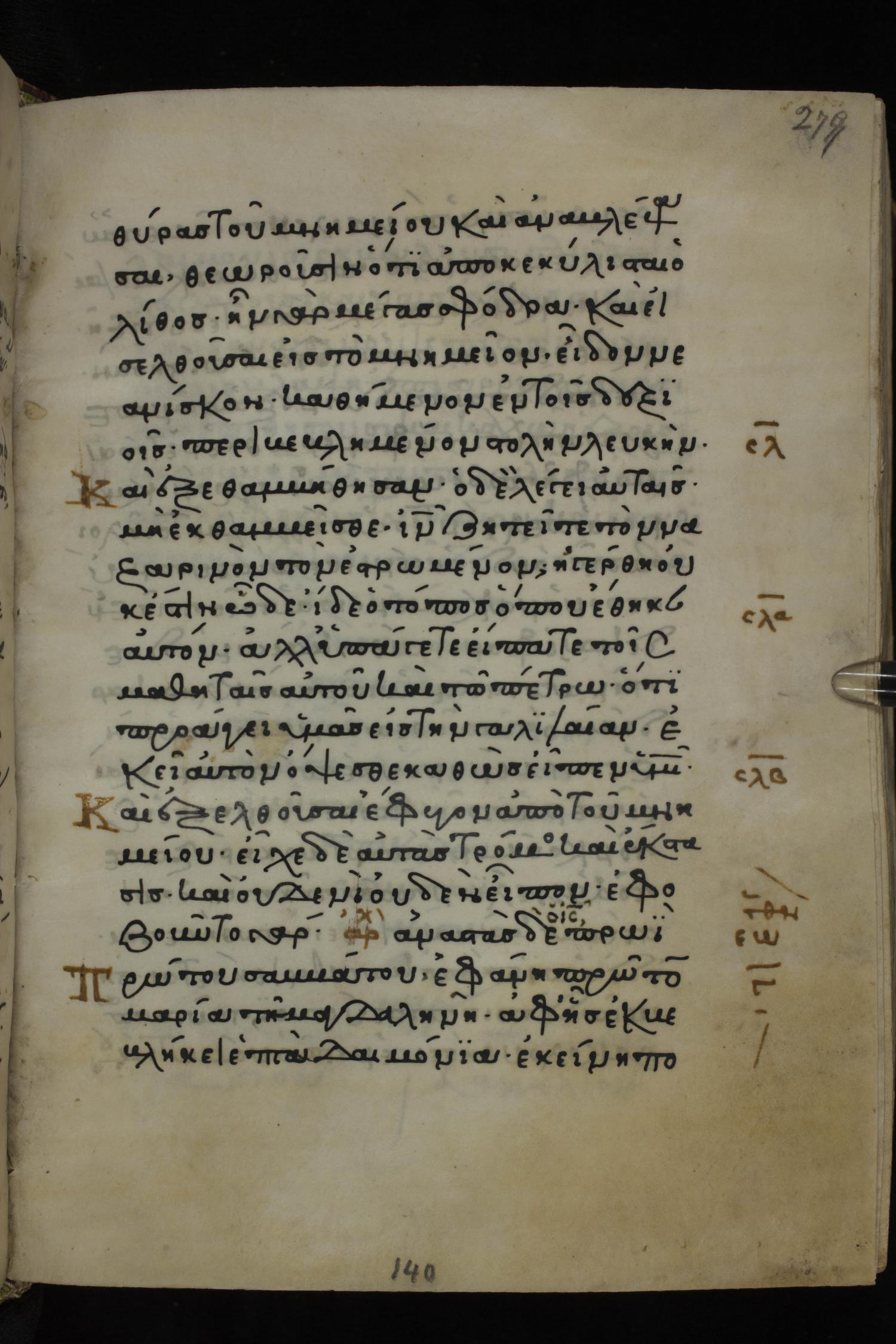 Twelfth century minuscule of the Gospels on parchment; 285 leaves, 1 column, 21-23 lines per column. Images were taken at the National Library of Greece in Athens.