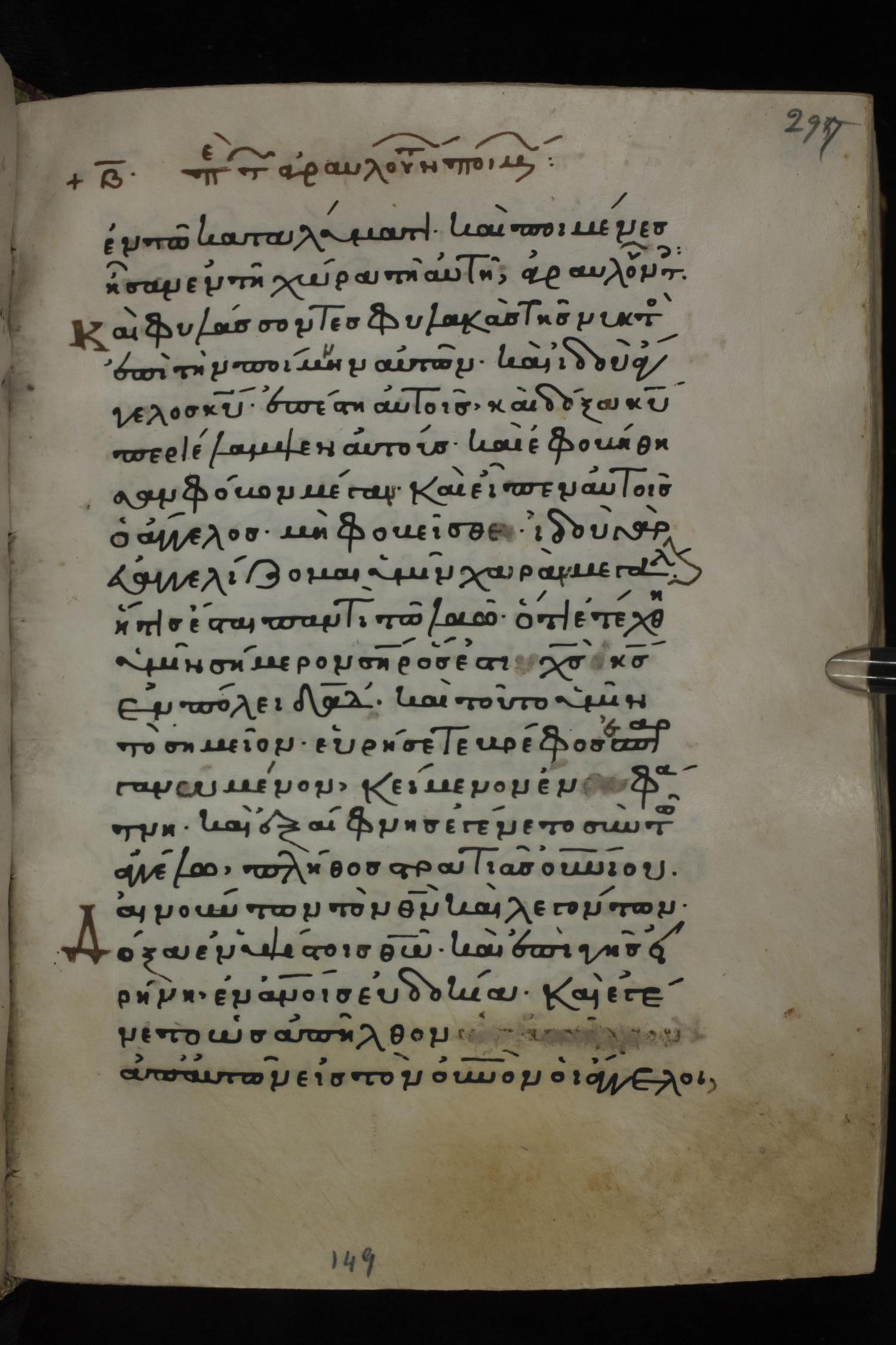 Twelfth century minuscule of the Gospels on parchment; 285 leaves, 1 column, 21-23 lines per column. Images were taken at the National Library of Greece in Athens.
