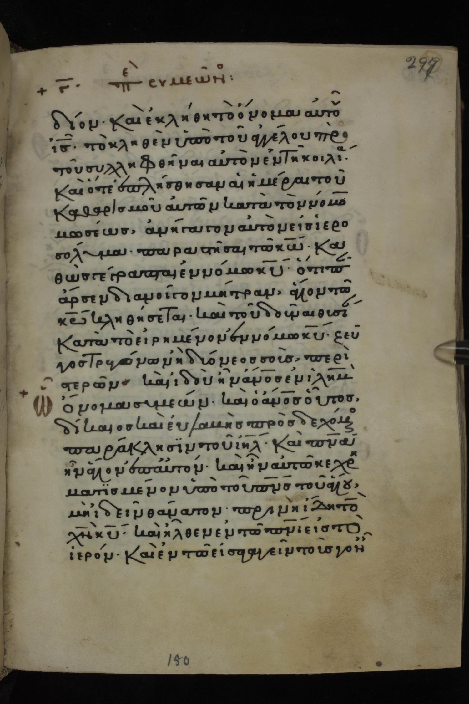 Twelfth century minuscule of the Gospels on parchment; 285 leaves, 1 column, 21-23 lines per column. Images were taken at the National Library of Greece in Athens.