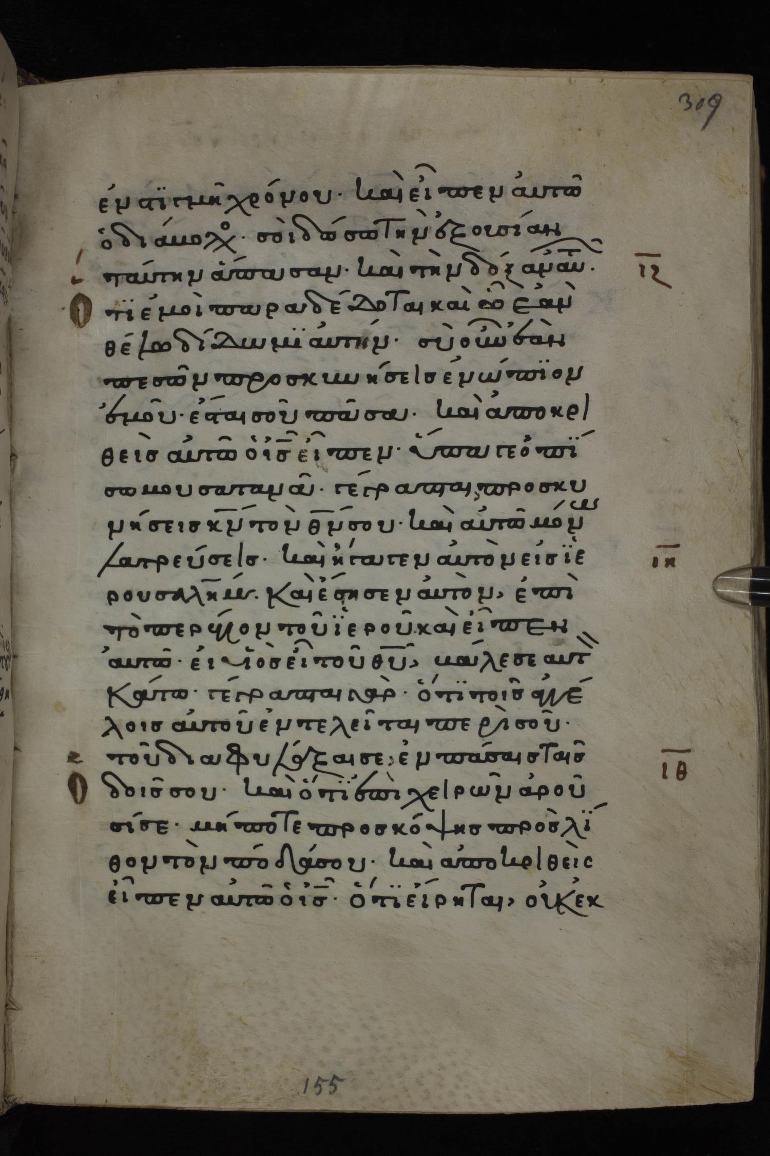 Twelfth century minuscule of the Gospels on parchment; 285 leaves, 1 column, 21-23 lines per column. Images were taken at the National Library of Greece in Athens.