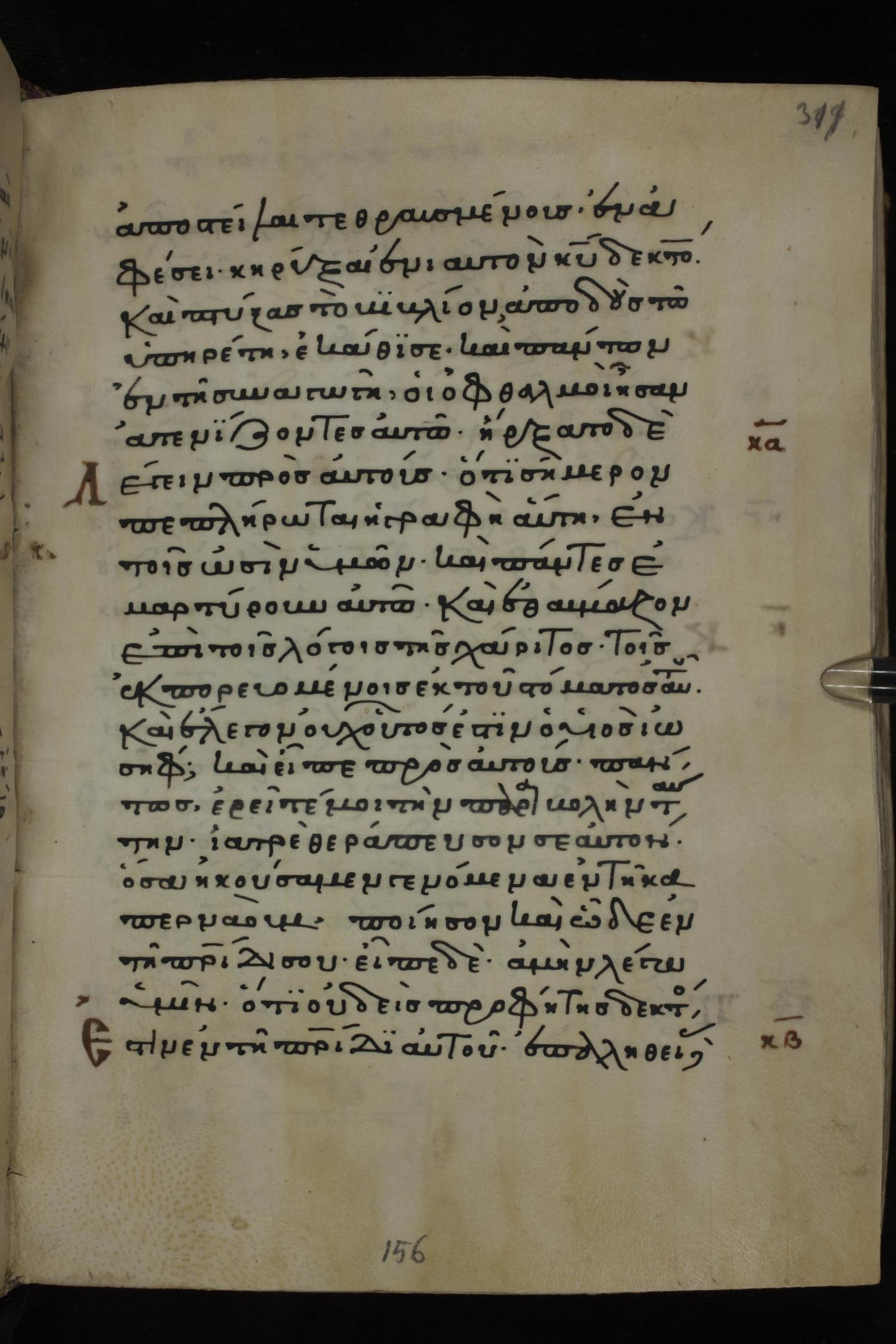 Twelfth century minuscule of the Gospels on parchment; 285 leaves, 1 column, 21-23 lines per column. Images were taken at the National Library of Greece in Athens.