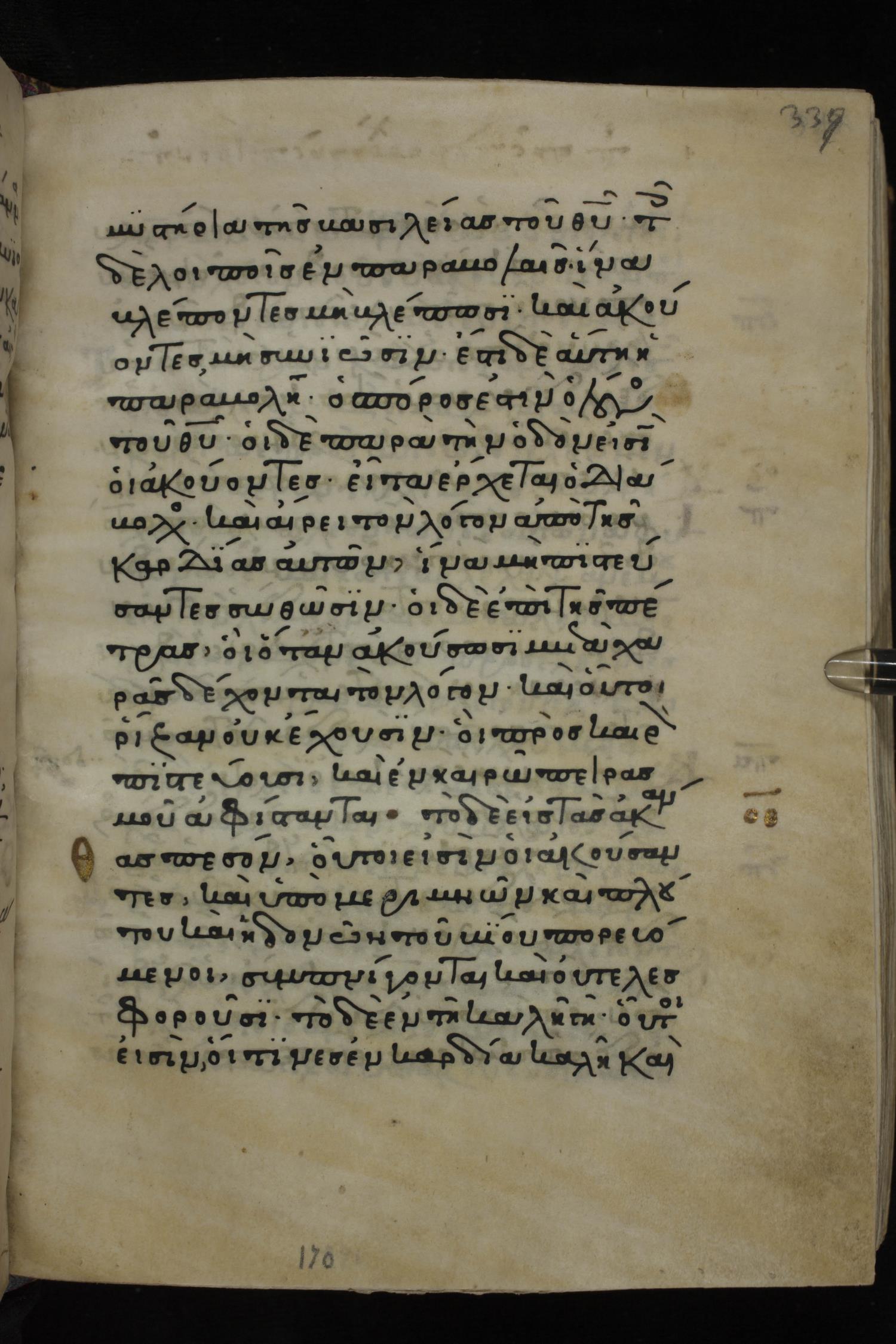Twelfth century minuscule of the Gospels on parchment; 285 leaves, 1 column, 21-23 lines per column. Images were taken at the National Library of Greece in Athens.