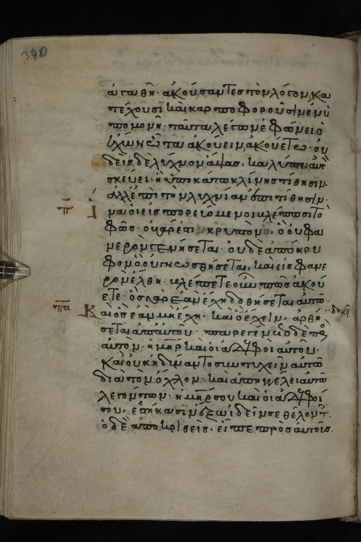 Twelfth century minuscule of the Gospels on parchment; 285 leaves, 1 column, 21-23 lines per column. Images were taken at the National Library of Greece in Athens.