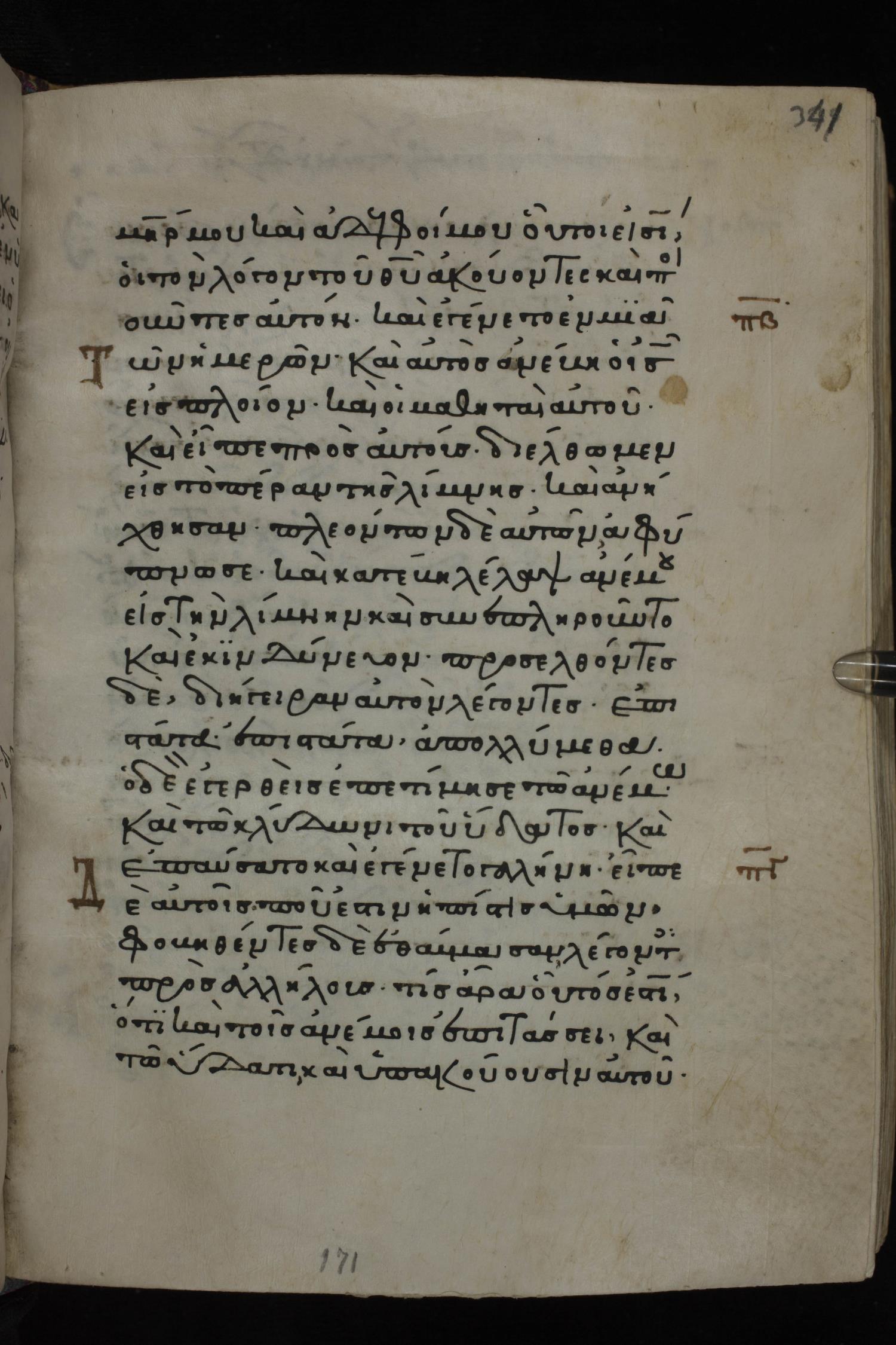 Twelfth century minuscule of the Gospels on parchment; 285 leaves, 1 column, 21-23 lines per column. Images were taken at the National Library of Greece in Athens.
