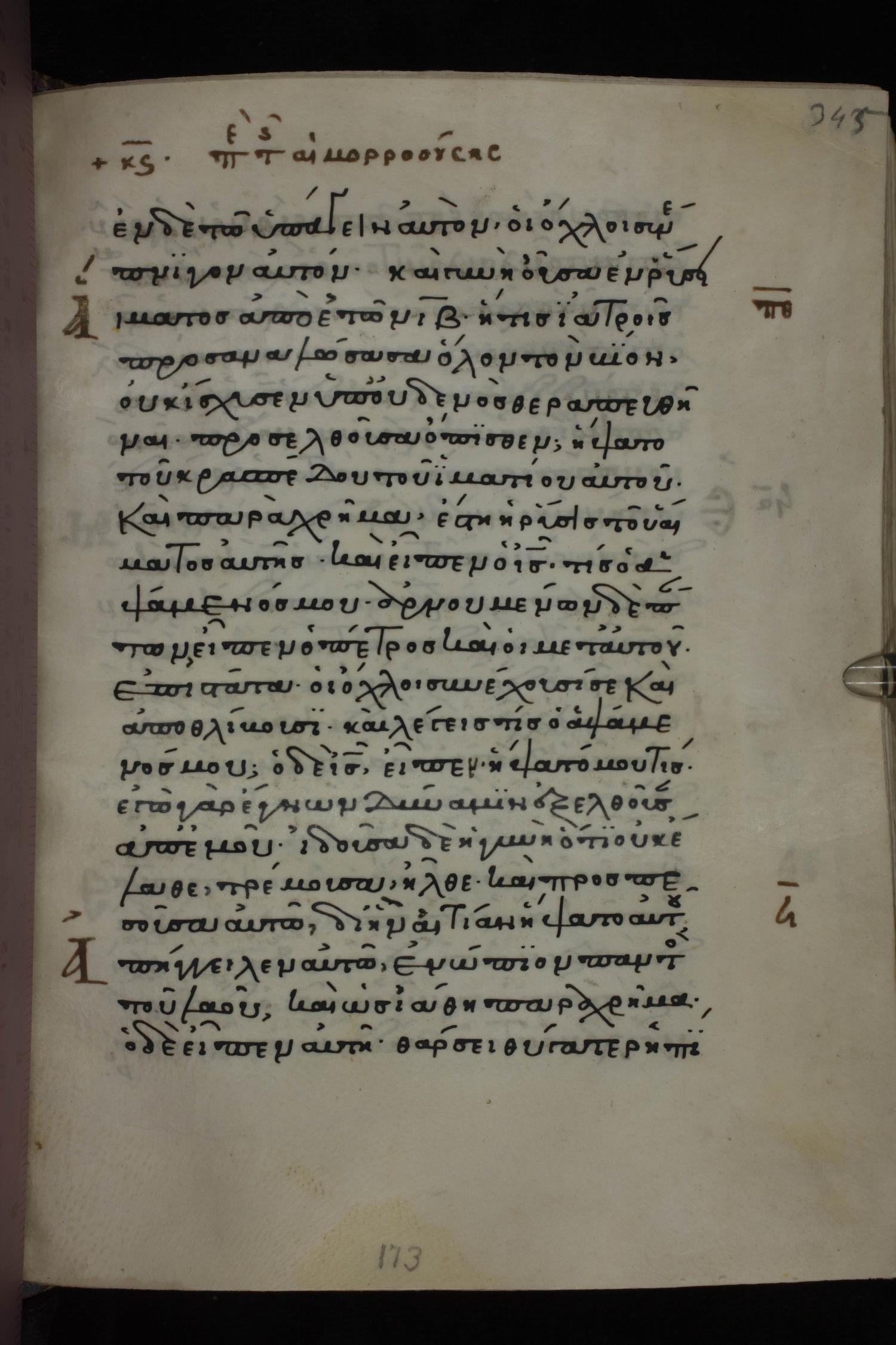Twelfth century minuscule of the Gospels on parchment; 285 leaves, 1 column, 21-23 lines per column. Images were taken at the National Library of Greece in Athens.