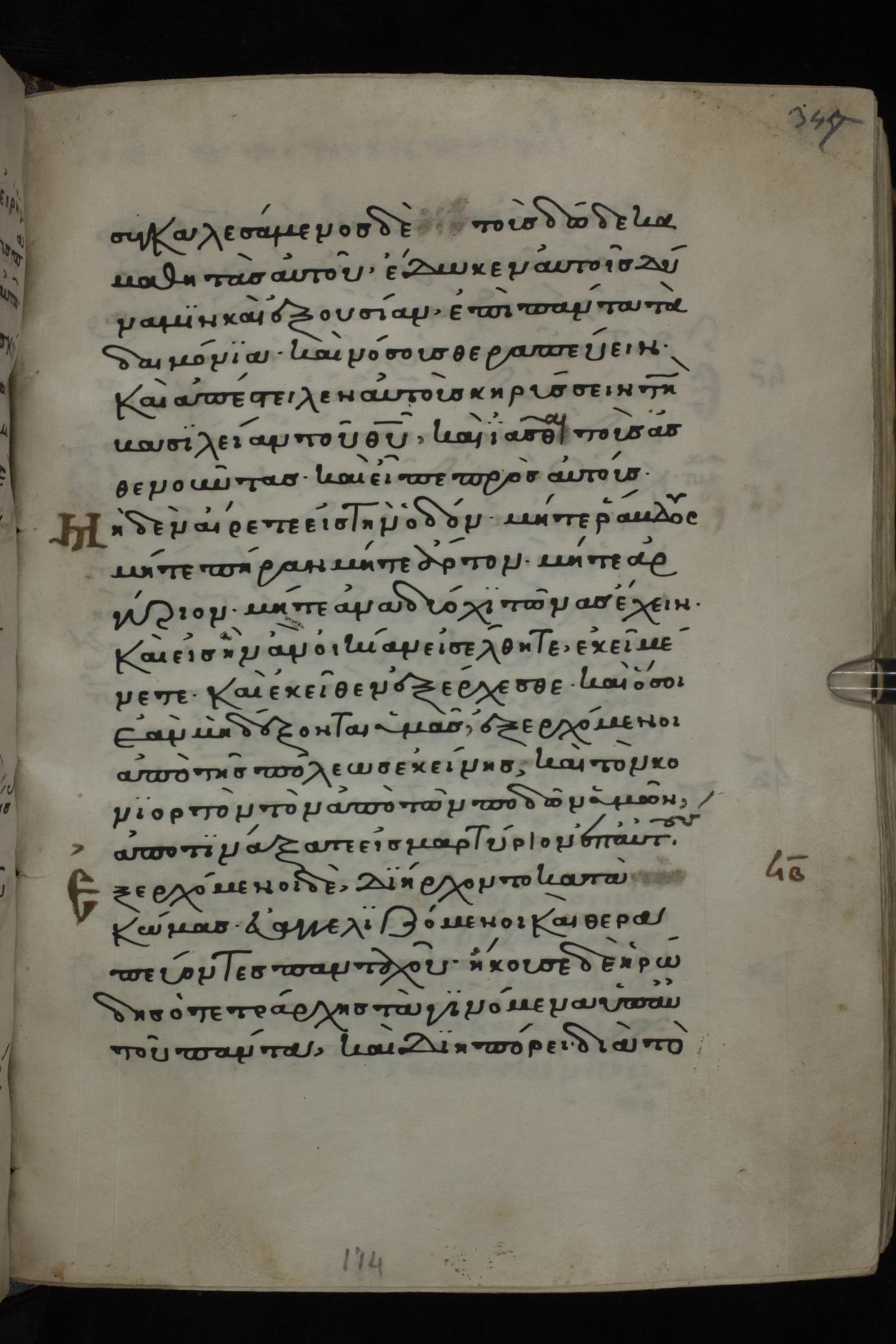 Twelfth century minuscule of the Gospels on parchment; 285 leaves, 1 column, 21-23 lines per column. Images were taken at the National Library of Greece in Athens.