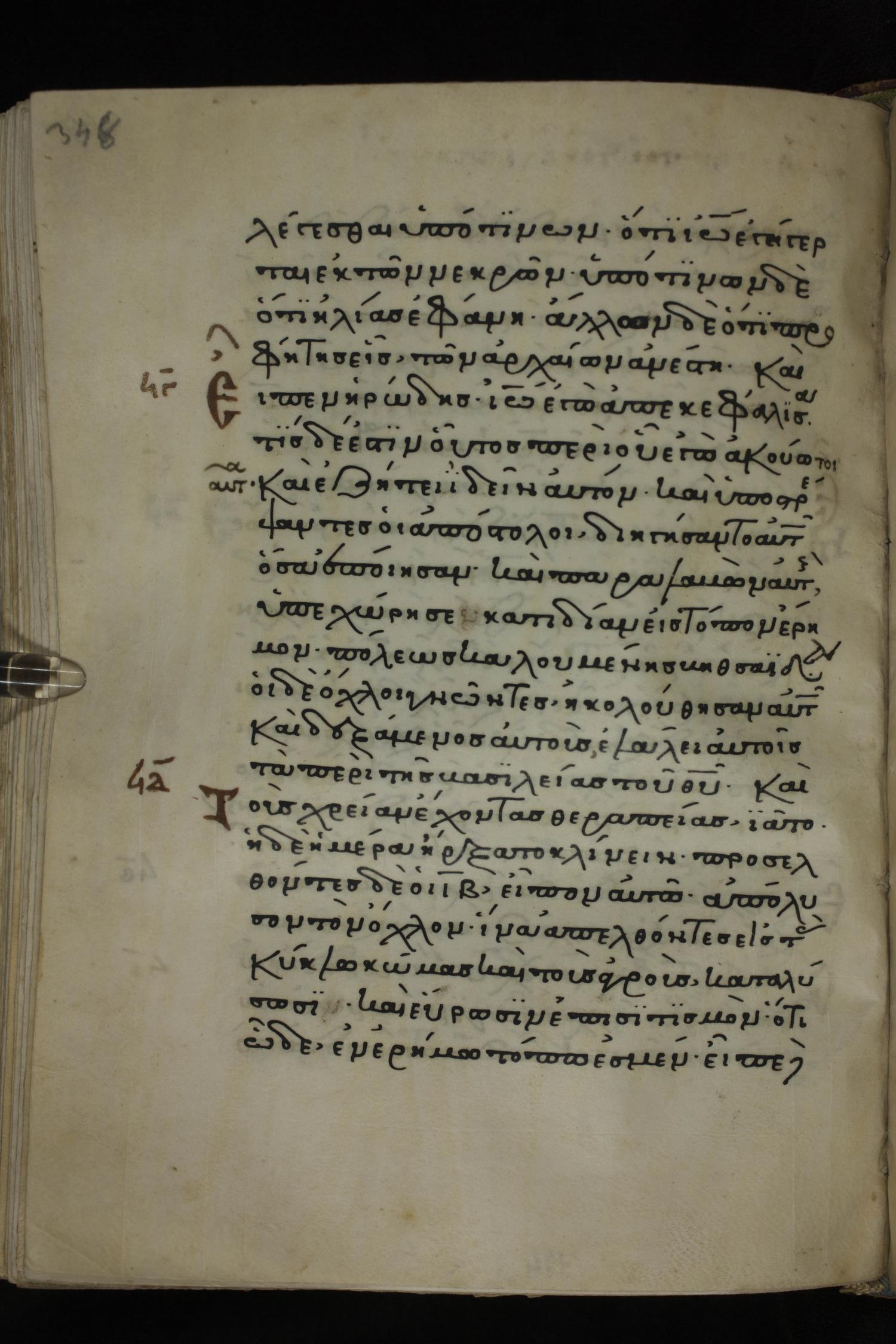 Twelfth century minuscule of the Gospels on parchment; 285 leaves, 1 column, 21-23 lines per column. Images were taken at the National Library of Greece in Athens.