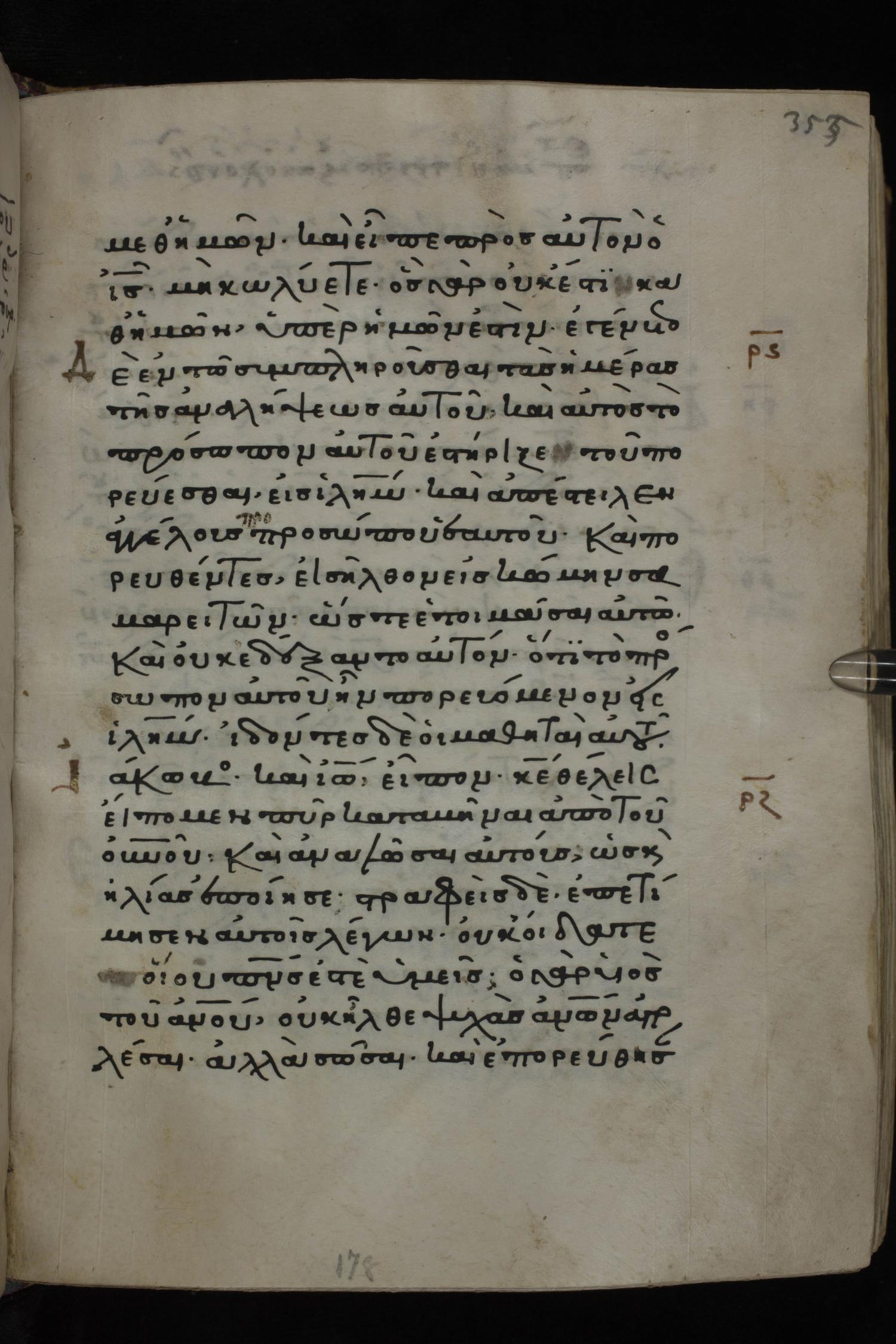 Twelfth century minuscule of the Gospels on parchment; 285 leaves, 1 column, 21-23 lines per column. Images were taken at the National Library of Greece in Athens.