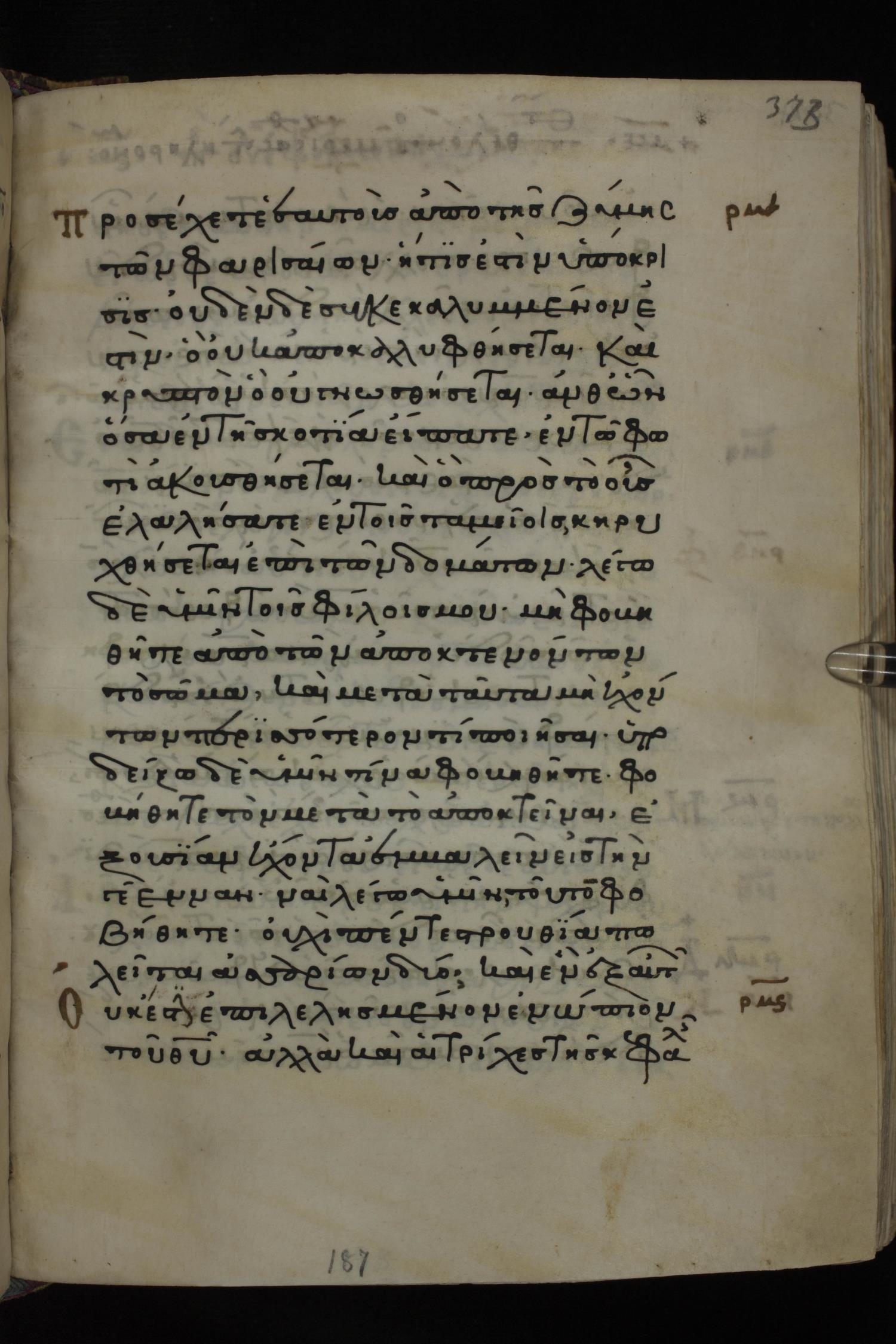 Twelfth century minuscule of the Gospels on parchment; 285 leaves, 1 column, 21-23 lines per column. Images were taken at the National Library of Greece in Athens.