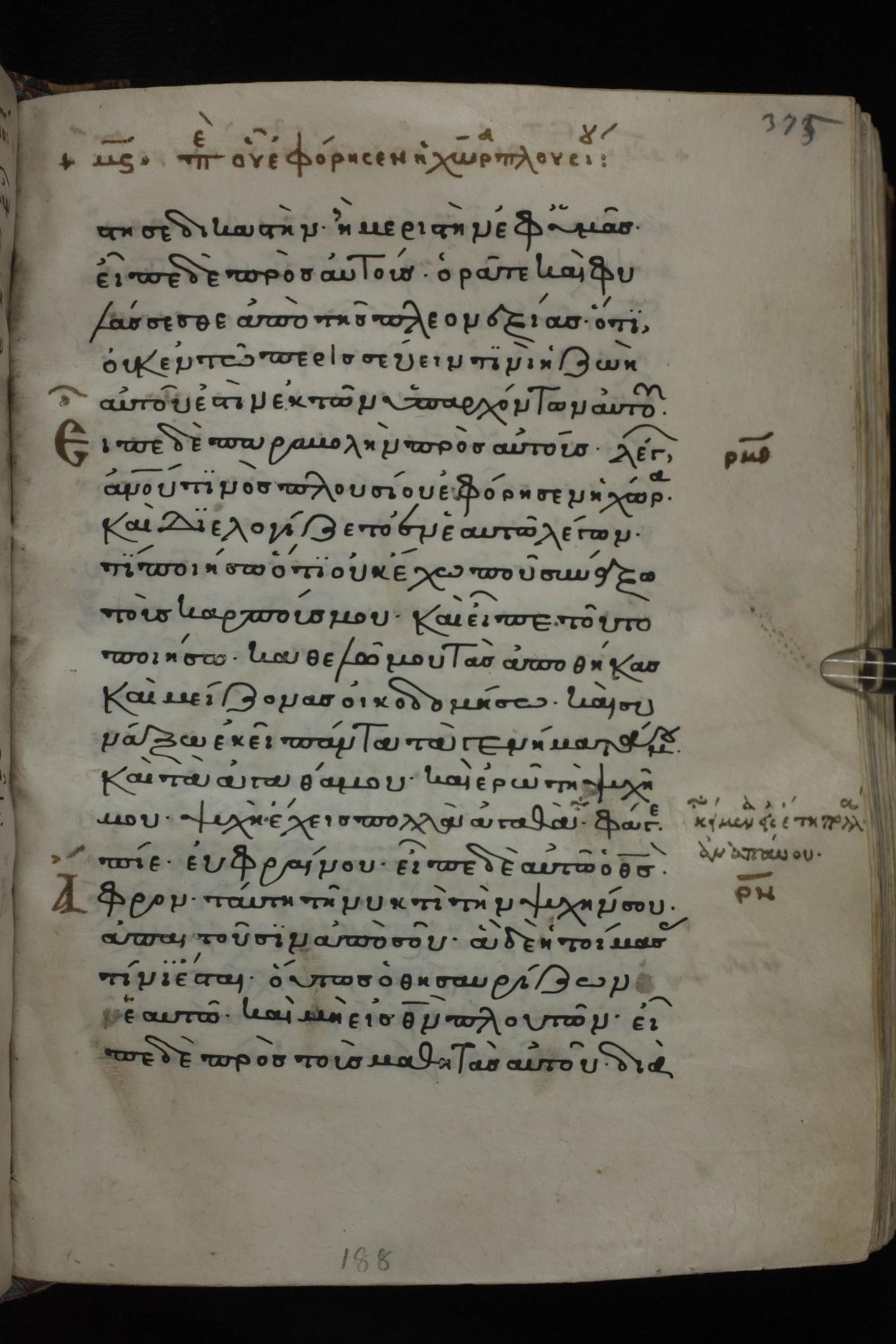 Twelfth century minuscule of the Gospels on parchment; 285 leaves, 1 column, 21-23 lines per column. Images were taken at the National Library of Greece in Athens.
