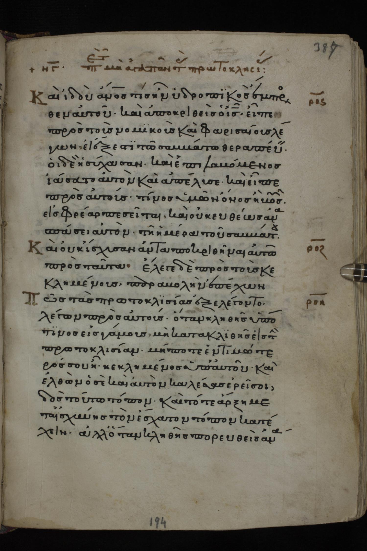 Twelfth century minuscule of the Gospels on parchment; 285 leaves, 1 column, 21-23 lines per column. Images were taken at the National Library of Greece in Athens.