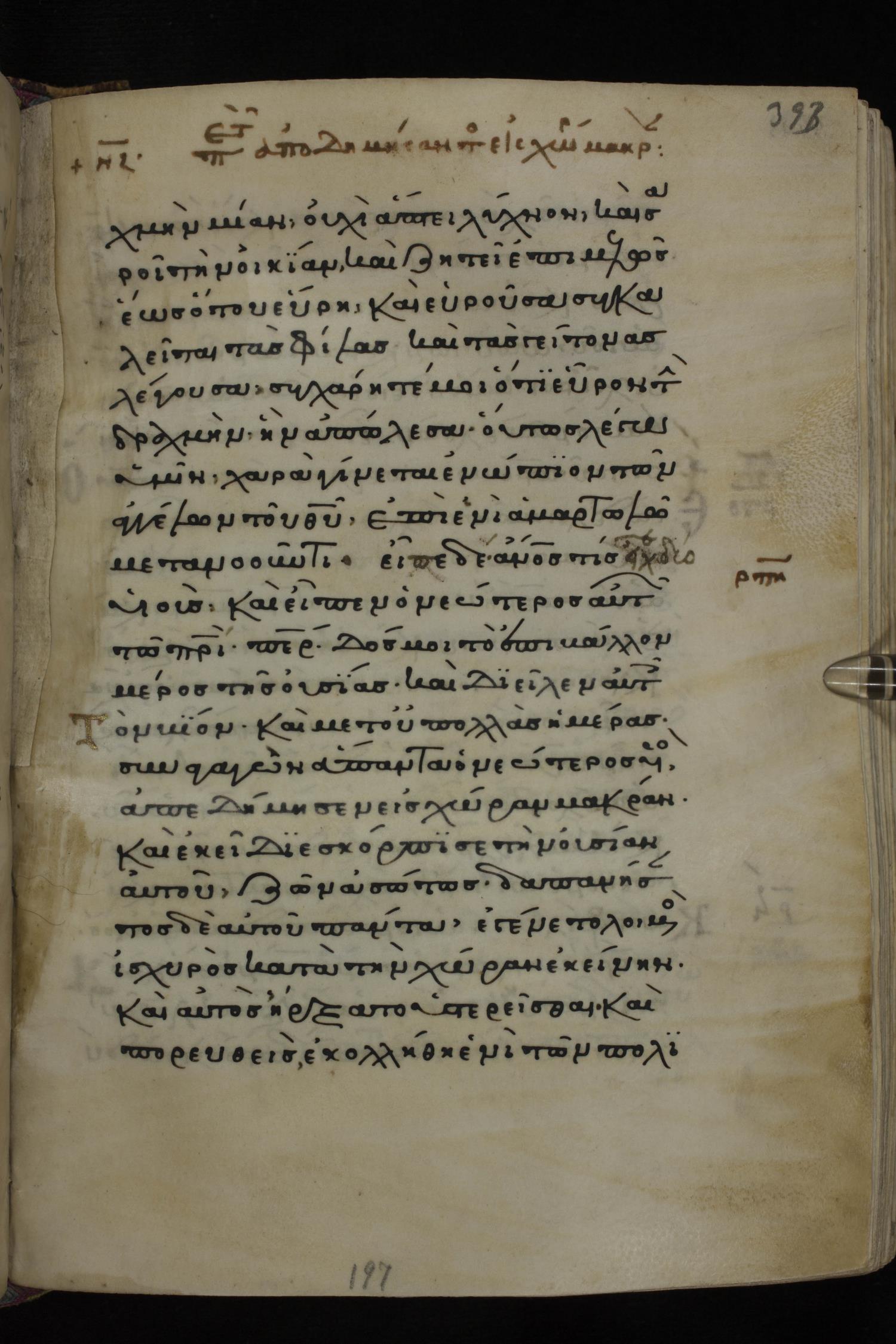 Twelfth century minuscule of the Gospels on parchment; 285 leaves, 1 column, 21-23 lines per column. Images were taken at the National Library of Greece in Athens.