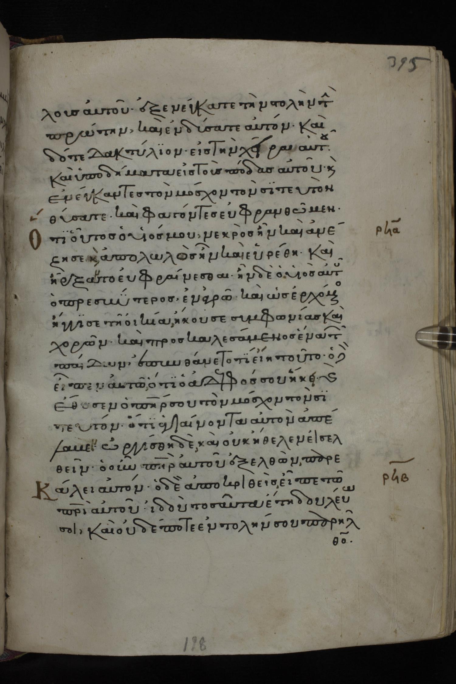 Twelfth century minuscule of the Gospels on parchment; 285 leaves, 1 column, 21-23 lines per column. Images were taken at the National Library of Greece in Athens.