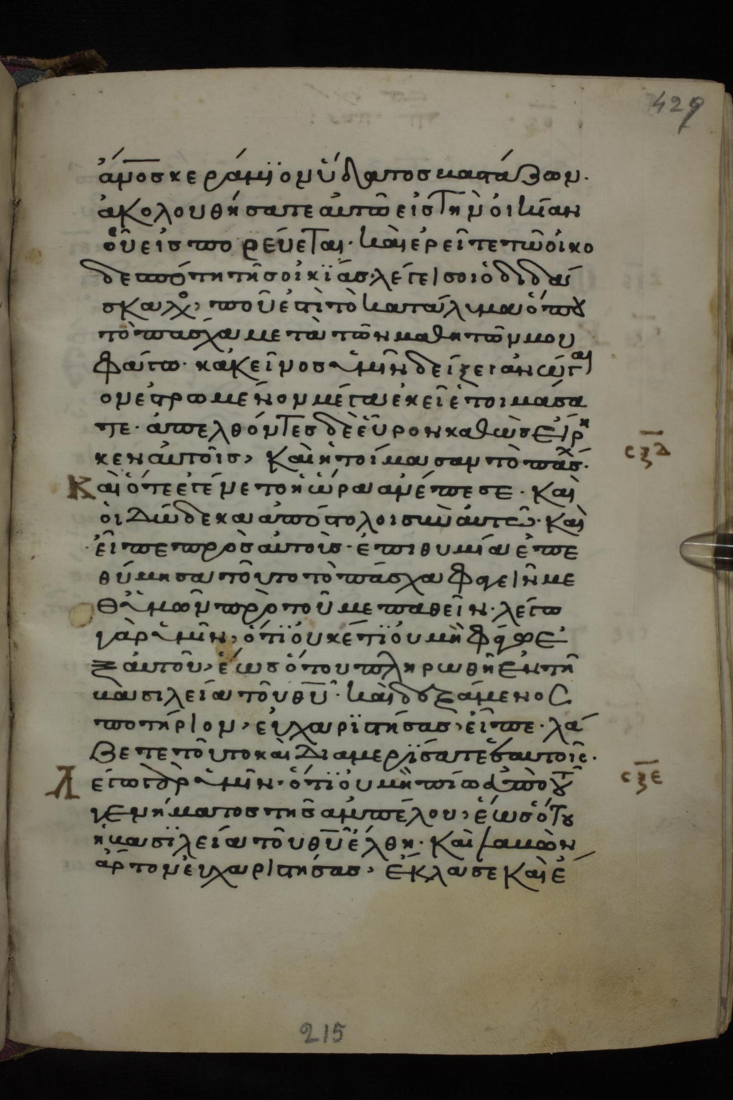 Twelfth century minuscule of the Gospels on parchment; 285 leaves, 1 column, 21-23 lines per column. Images were taken at the National Library of Greece in Athens.