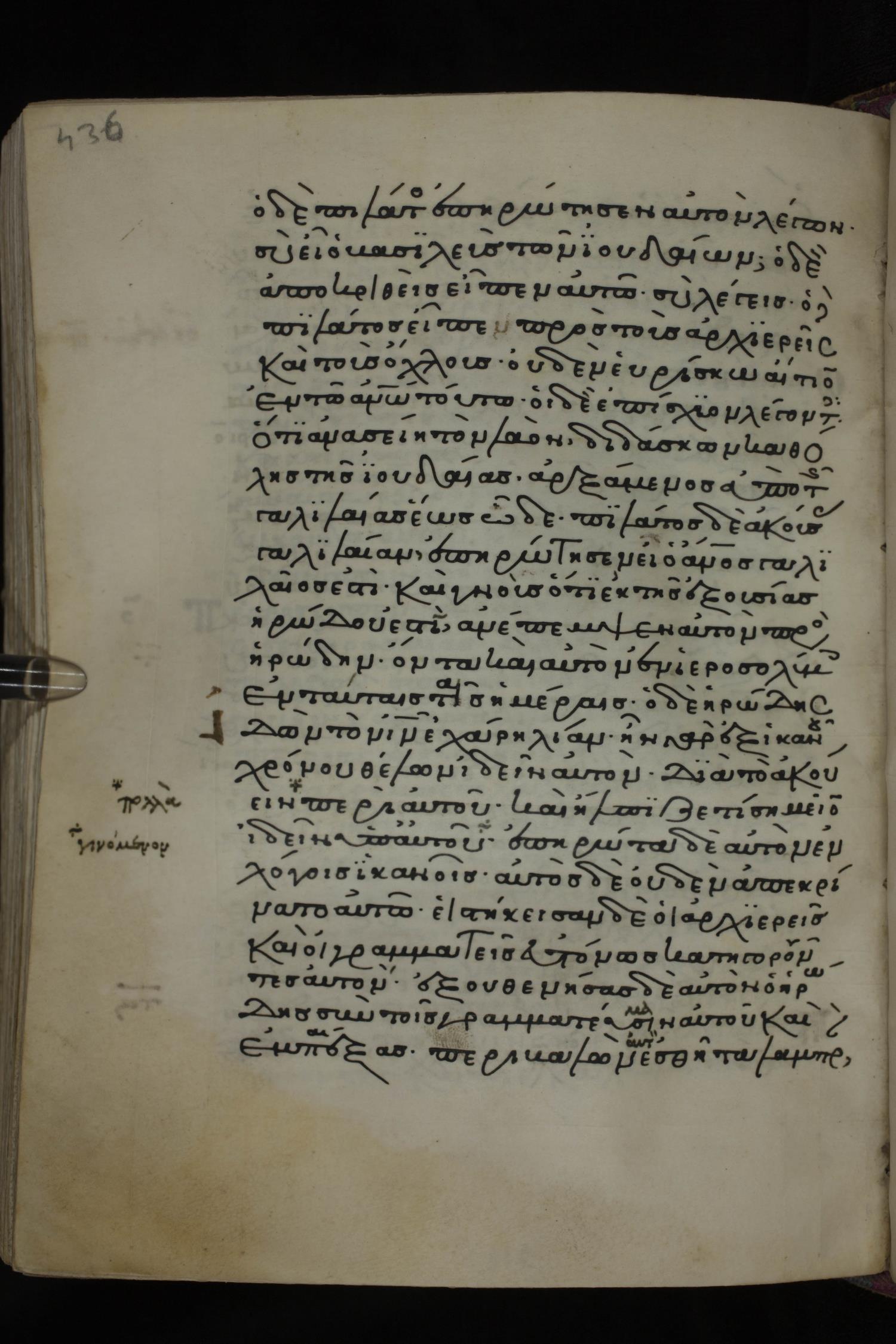 Twelfth century minuscule of the Gospels on parchment; 285 leaves, 1 column, 21-23 lines per column. Images were taken at the National Library of Greece in Athens.