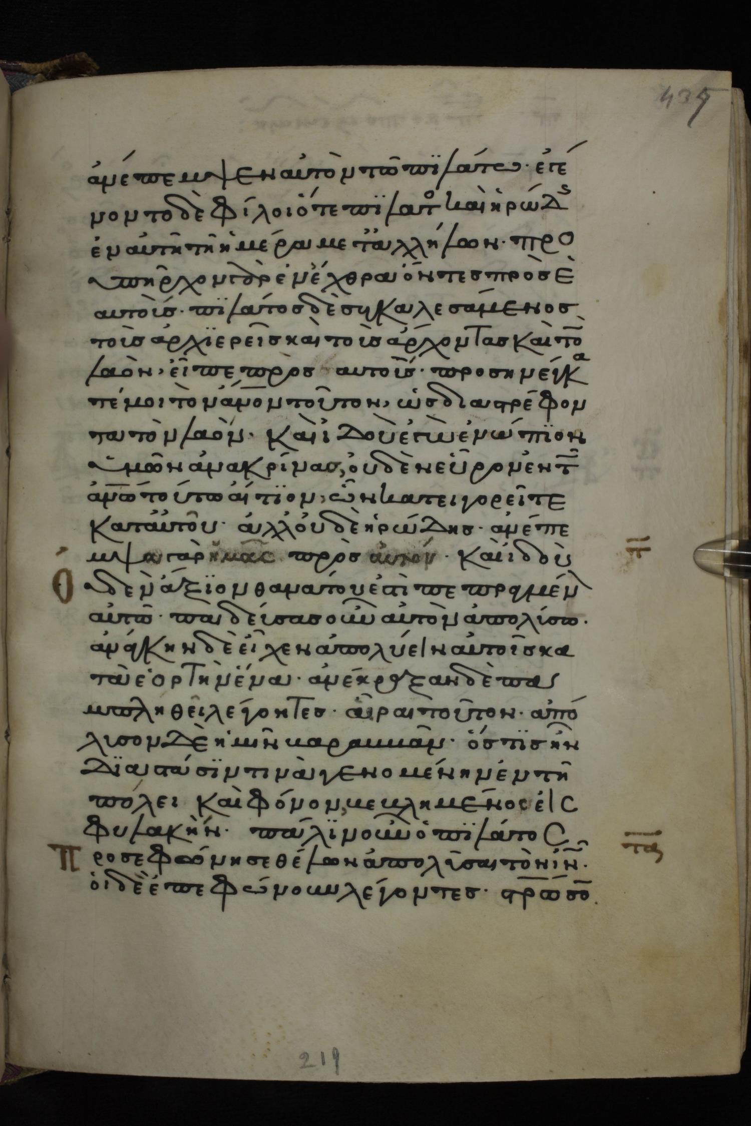 Twelfth century minuscule of the Gospels on parchment; 285 leaves, 1 column, 21-23 lines per column. Images were taken at the National Library of Greece in Athens.