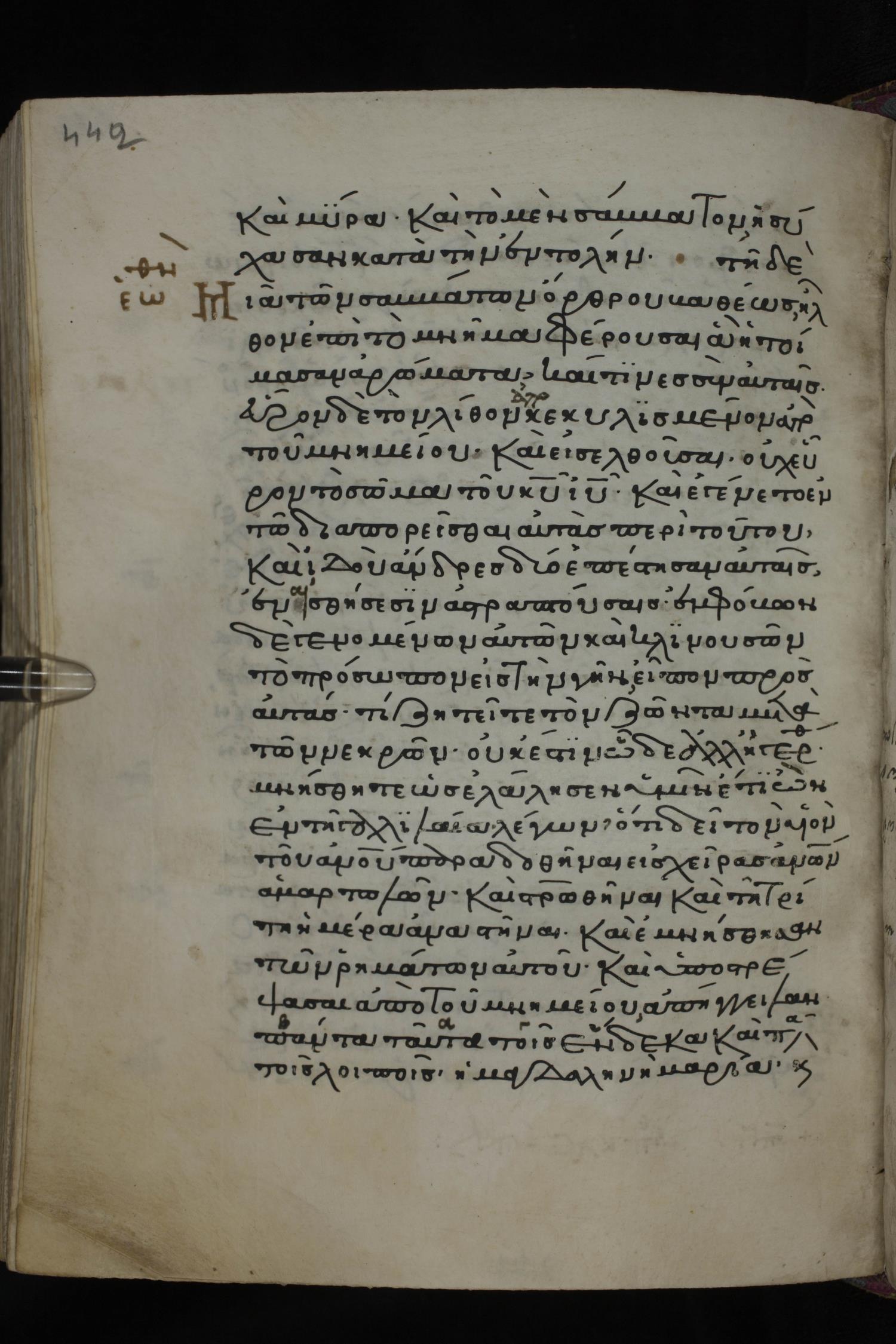 Twelfth century minuscule of the Gospels on parchment; 285 leaves, 1 column, 21-23 lines per column. Images were taken at the National Library of Greece in Athens.
