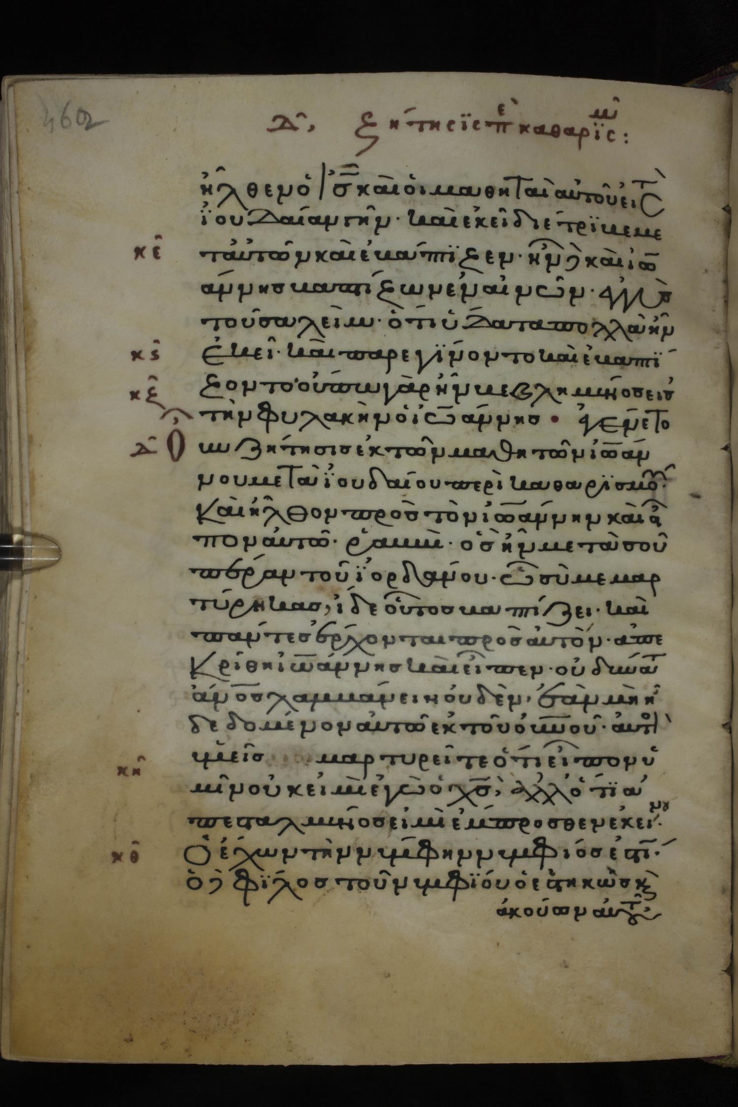 Twelfth century minuscule of the Gospels on parchment; 285 leaves, 1 column, 21-23 lines per column. Images were taken at the National Library of Greece in Athens.