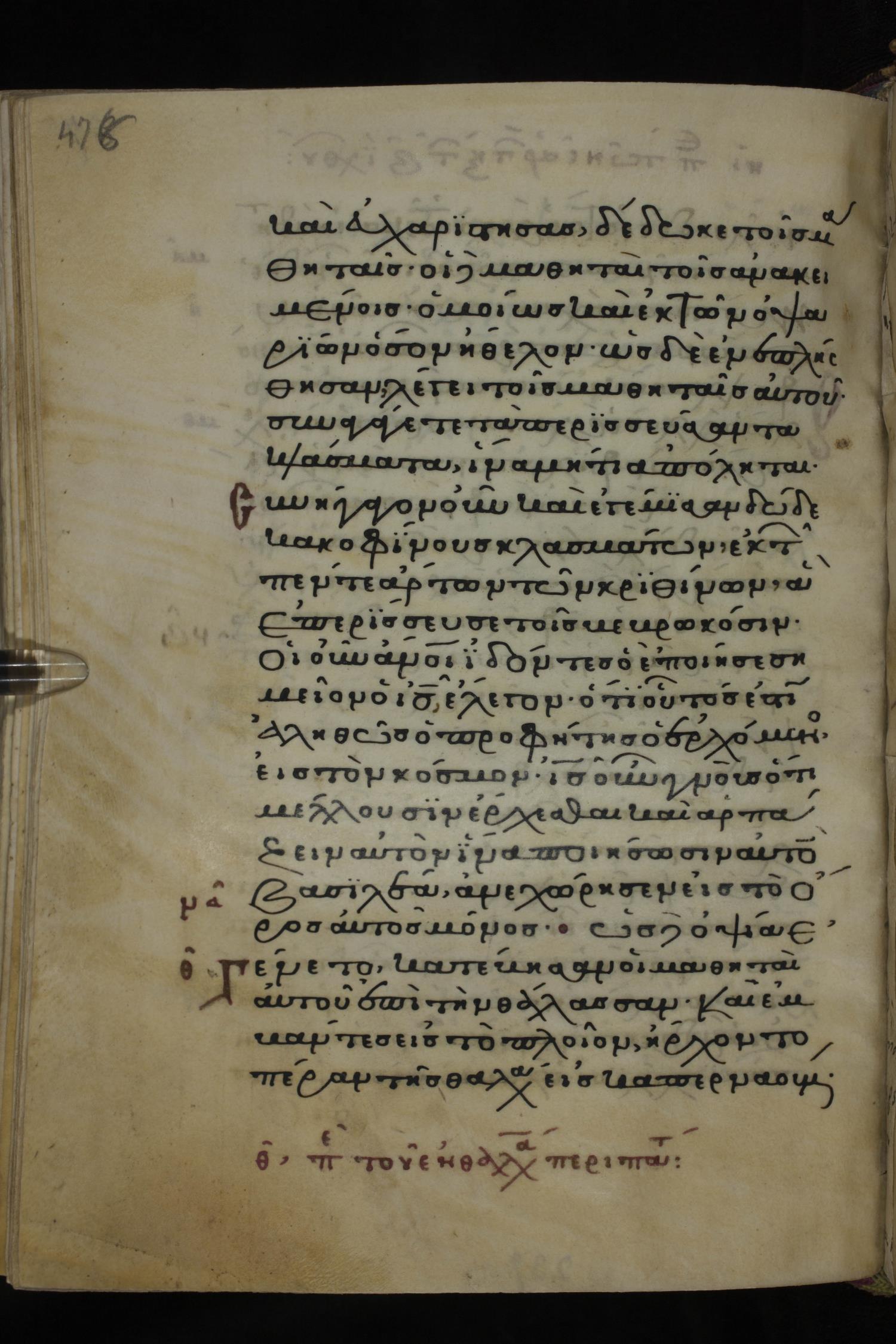 Twelfth century minuscule of the Gospels on parchment; 285 leaves, 1 column, 21-23 lines per column. Images were taken at the National Library of Greece in Athens.