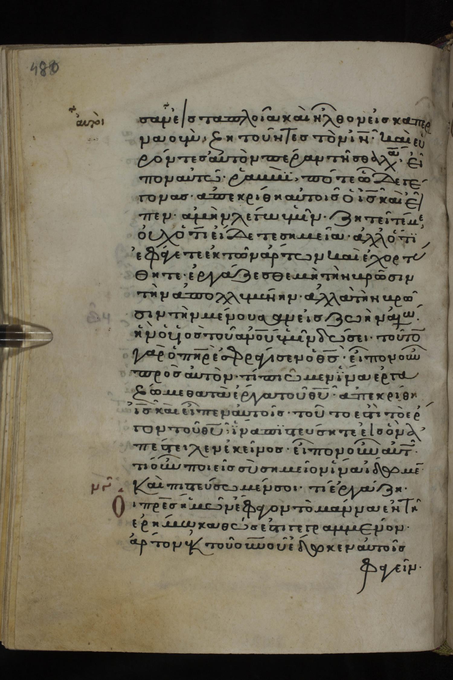 Twelfth century minuscule of the Gospels on parchment; 285 leaves, 1 column, 21-23 lines per column. Images were taken at the National Library of Greece in Athens.