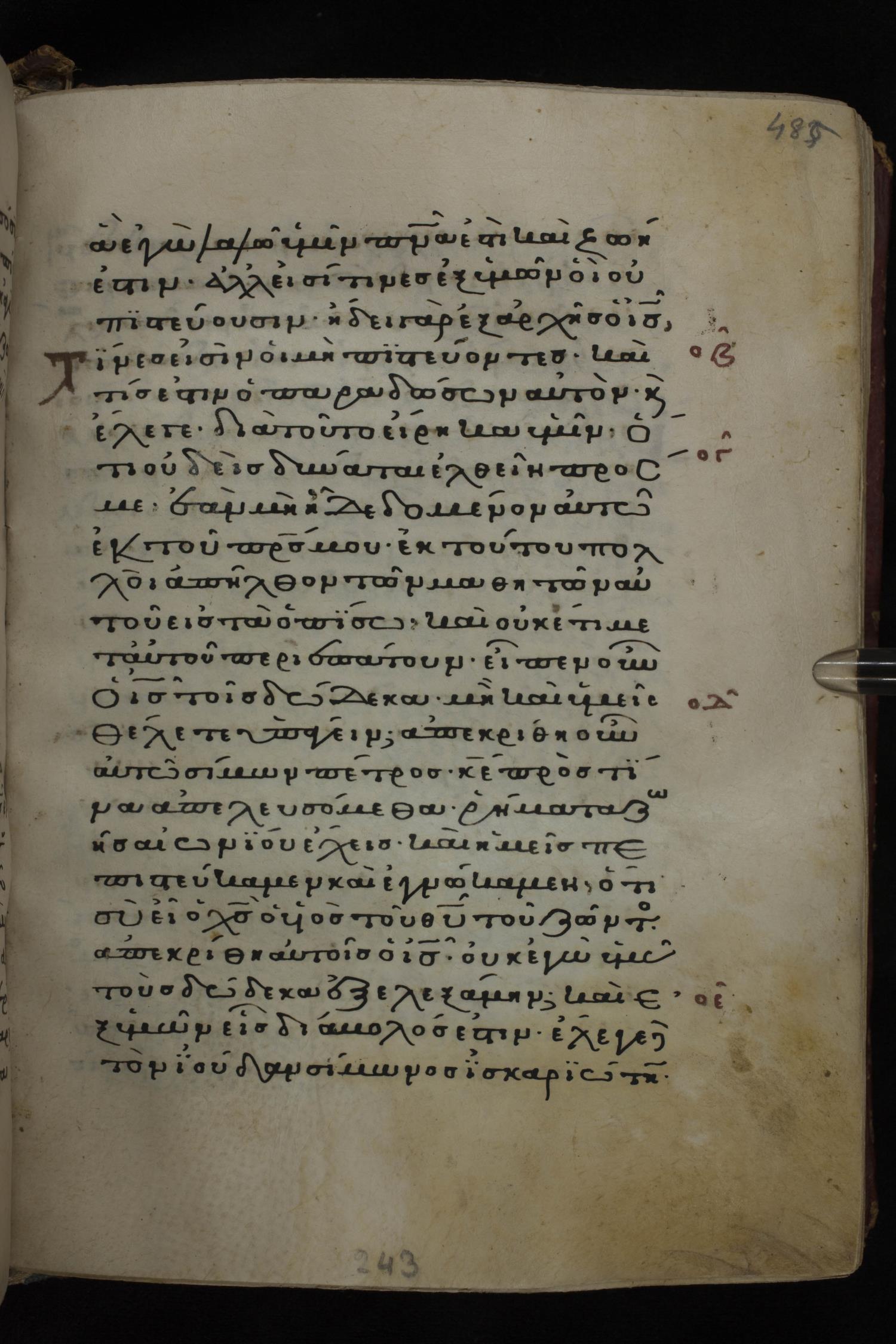 Twelfth century minuscule of the Gospels on parchment; 285 leaves, 1 column, 21-23 lines per column. Images were taken at the National Library of Greece in Athens.