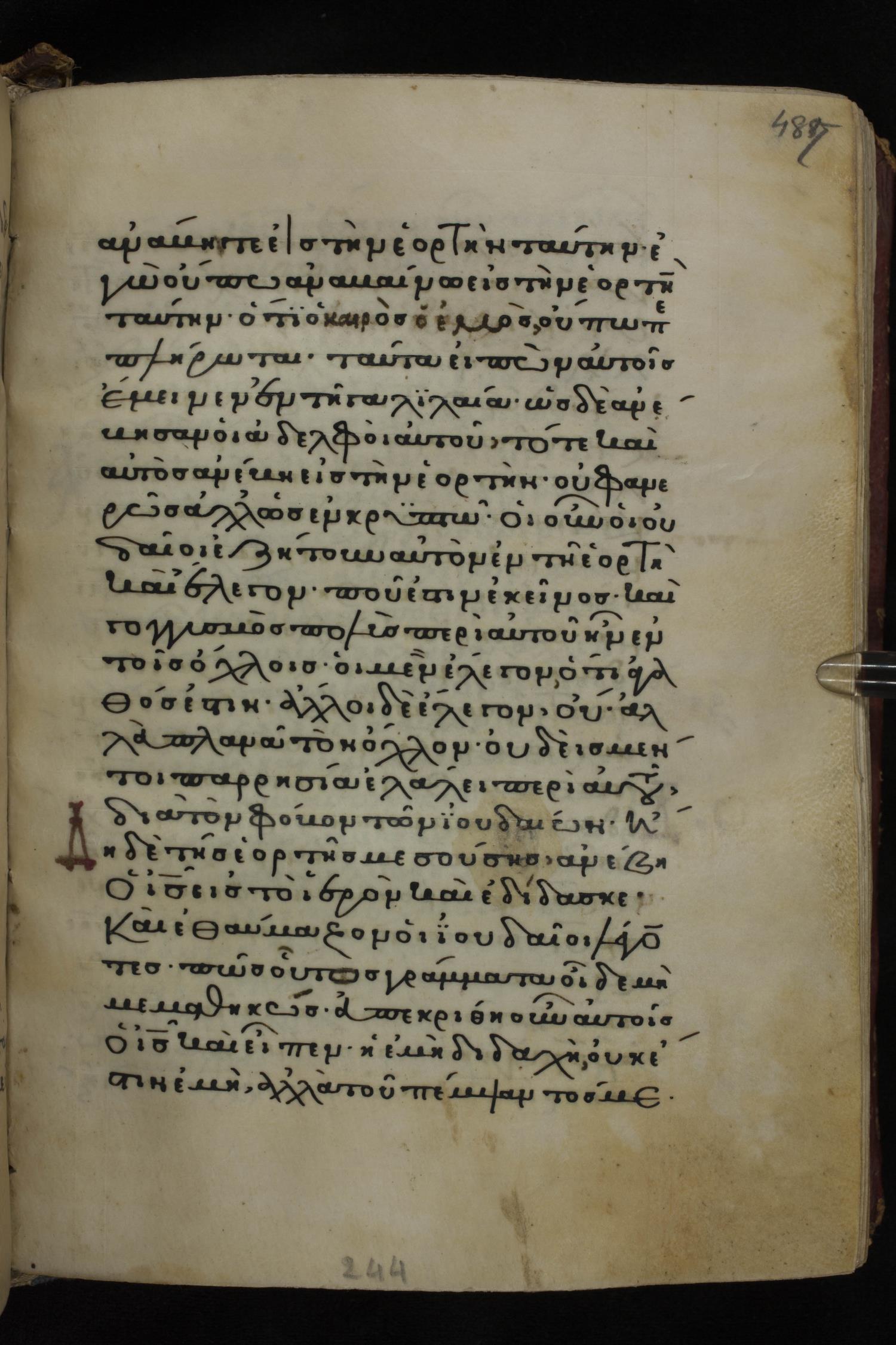 Twelfth century minuscule of the Gospels on parchment; 285 leaves, 1 column, 21-23 lines per column. Images were taken at the National Library of Greece in Athens.