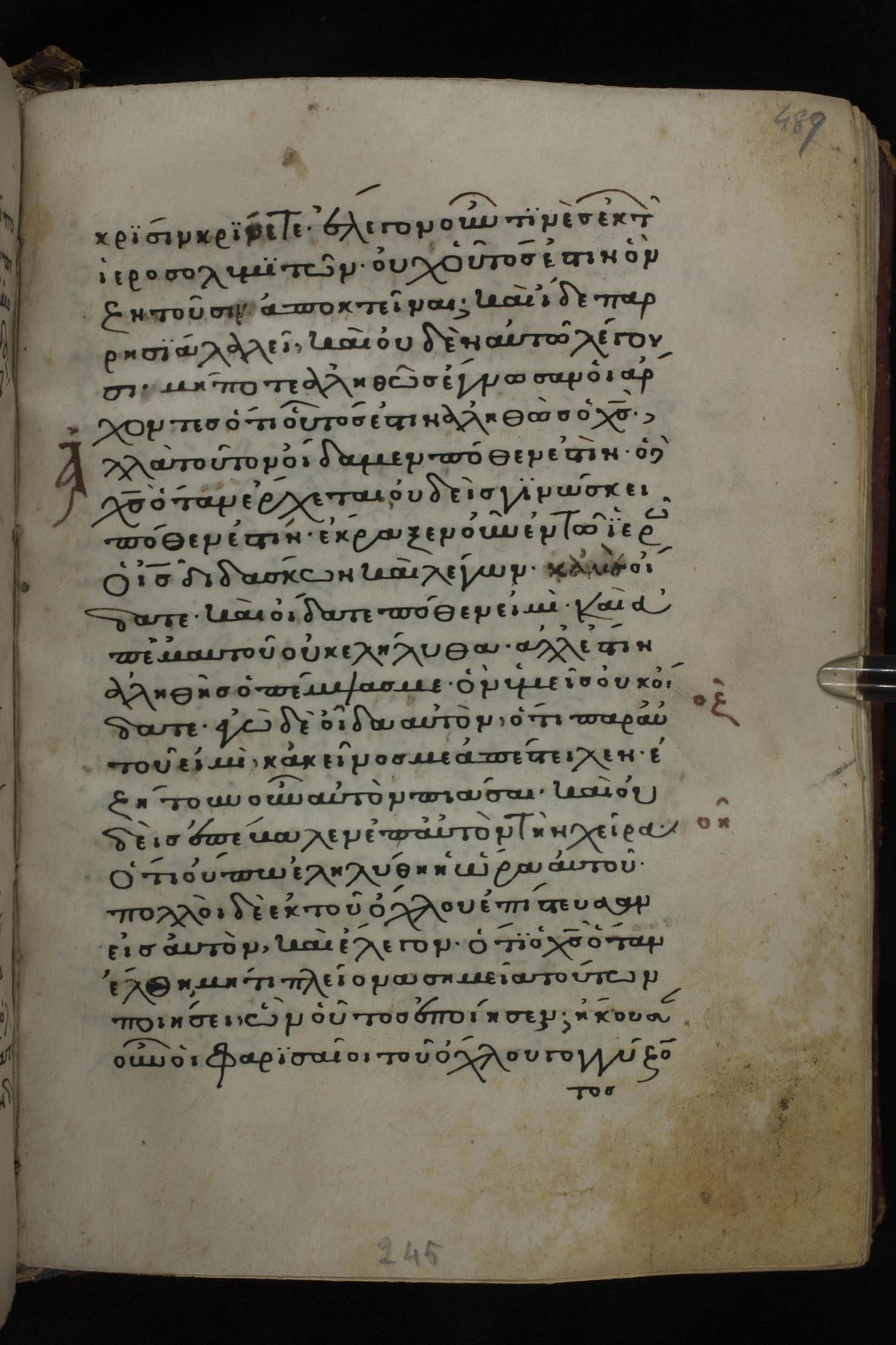 Twelfth century minuscule of the Gospels on parchment; 285 leaves, 1 column, 21-23 lines per column. Images were taken at the National Library of Greece in Athens.