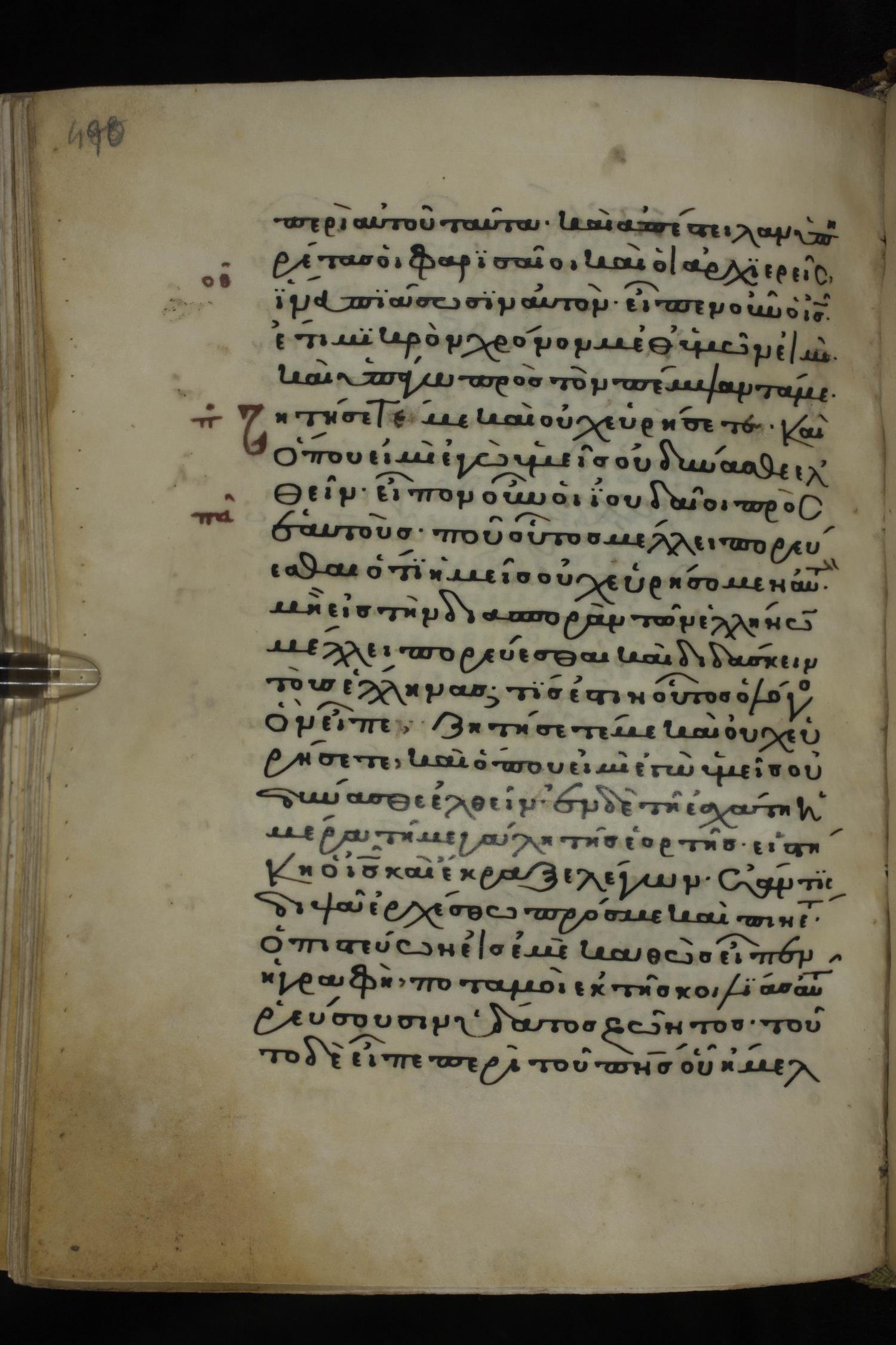 Twelfth century minuscule of the Gospels on parchment; 285 leaves, 1 column, 21-23 lines per column. Images were taken at the National Library of Greece in Athens.