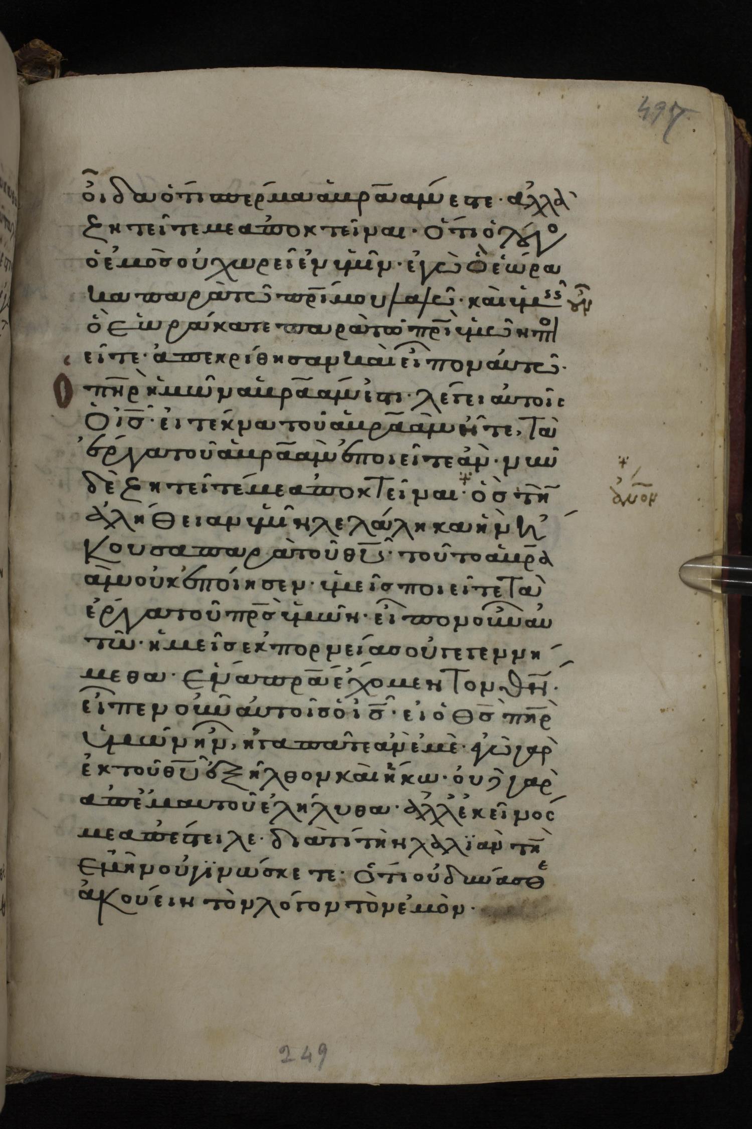 Twelfth century minuscule of the Gospels on parchment; 285 leaves, 1 column, 21-23 lines per column. Images were taken at the National Library of Greece in Athens.