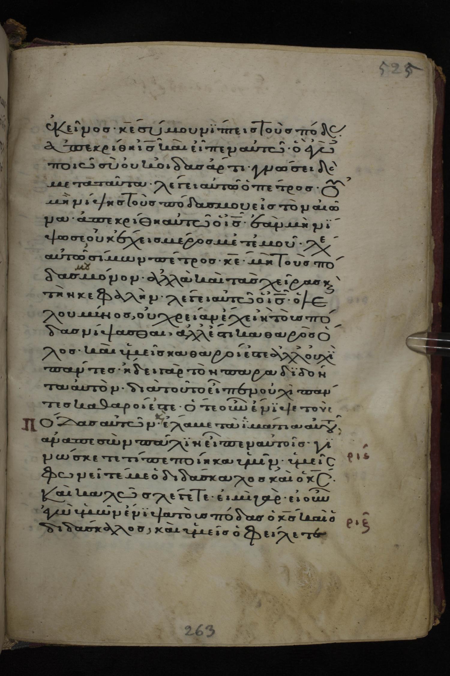 Twelfth century minuscule of the Gospels on parchment; 285 leaves, 1 column, 21-23 lines per column. Images were taken at the National Library of Greece in Athens.