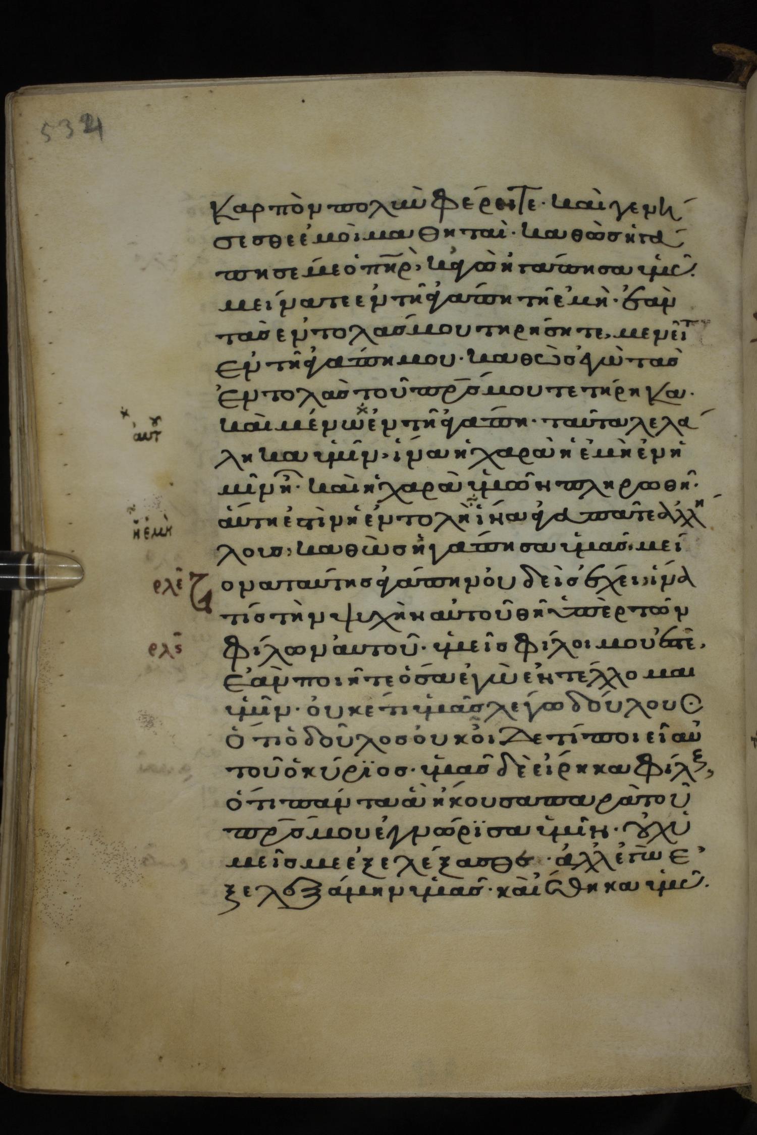 Twelfth century minuscule of the Gospels on parchment; 285 leaves, 1 column, 21-23 lines per column. Images were taken at the National Library of Greece in Athens.