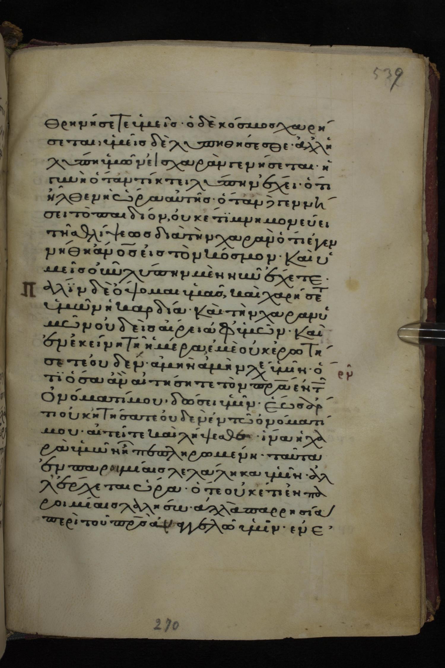 Twelfth century minuscule of the Gospels on parchment; 285 leaves, 1 column, 21-23 lines per column. Images were taken at the National Library of Greece in Athens.