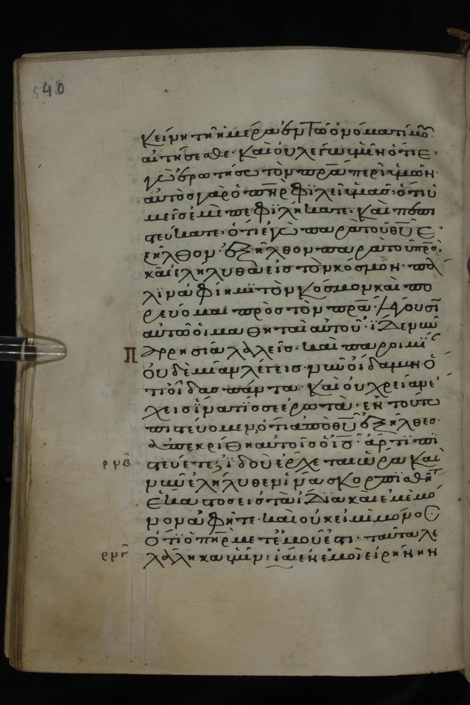 Twelfth century minuscule of the Gospels on parchment; 285 leaves, 1 column, 21-23 lines per column. Images were taken at the National Library of Greece in Athens.