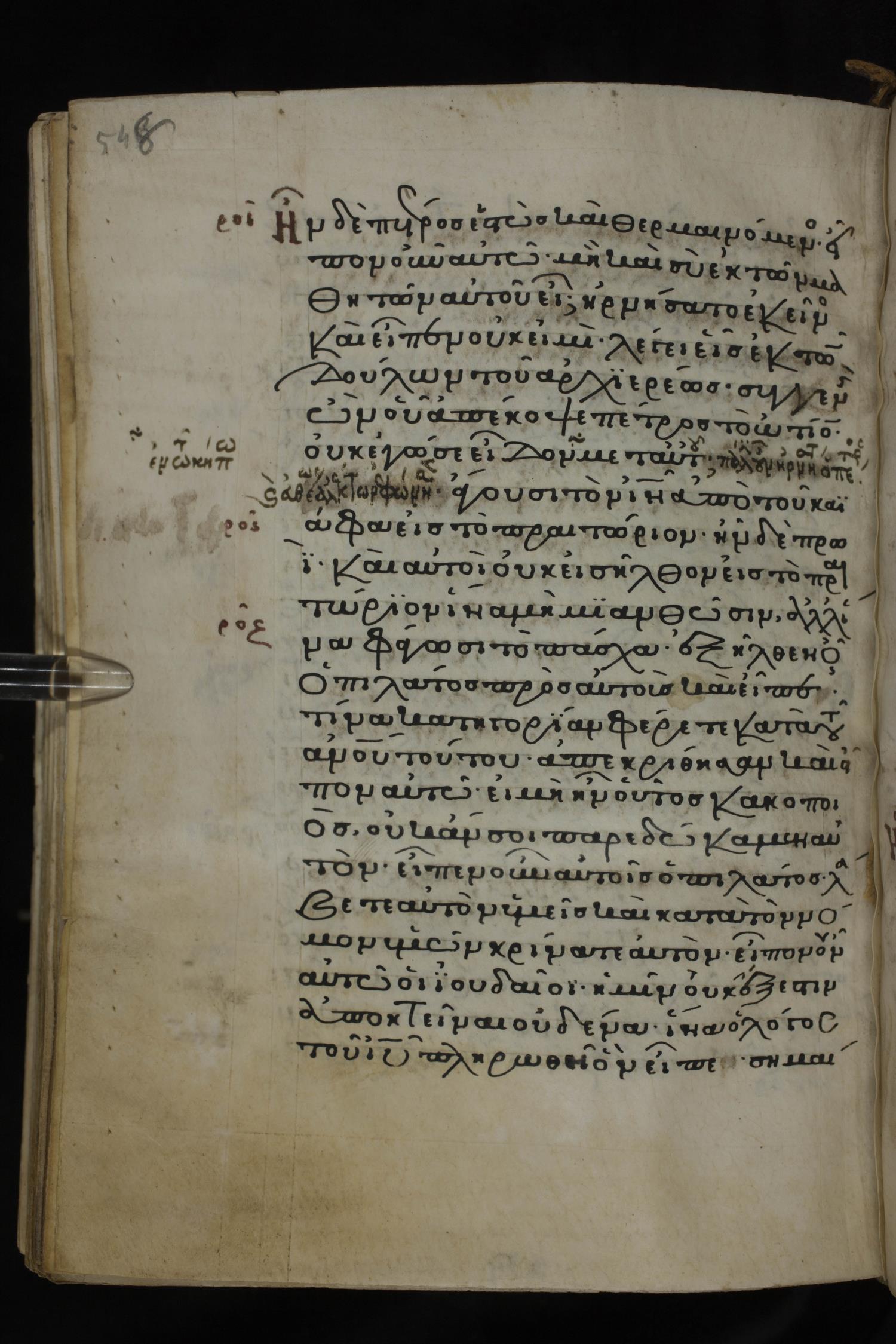 Twelfth century minuscule of the Gospels on parchment; 285 leaves, 1 column, 21-23 lines per column. Images were taken at the National Library of Greece in Athens.
