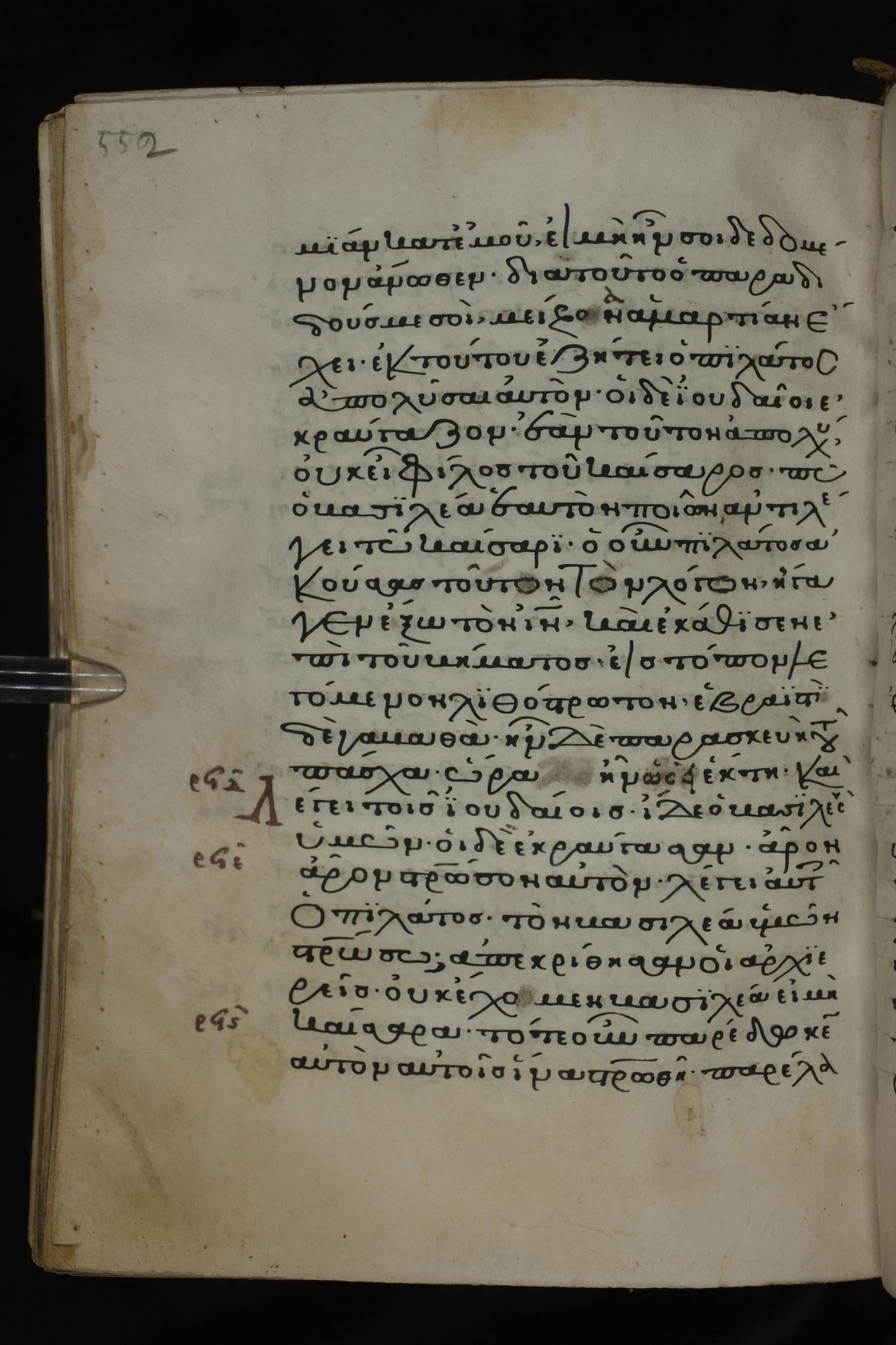 Twelfth century minuscule of the Gospels on parchment; 285 leaves, 1 column, 21-23 lines per column. Images were taken at the National Library of Greece in Athens.