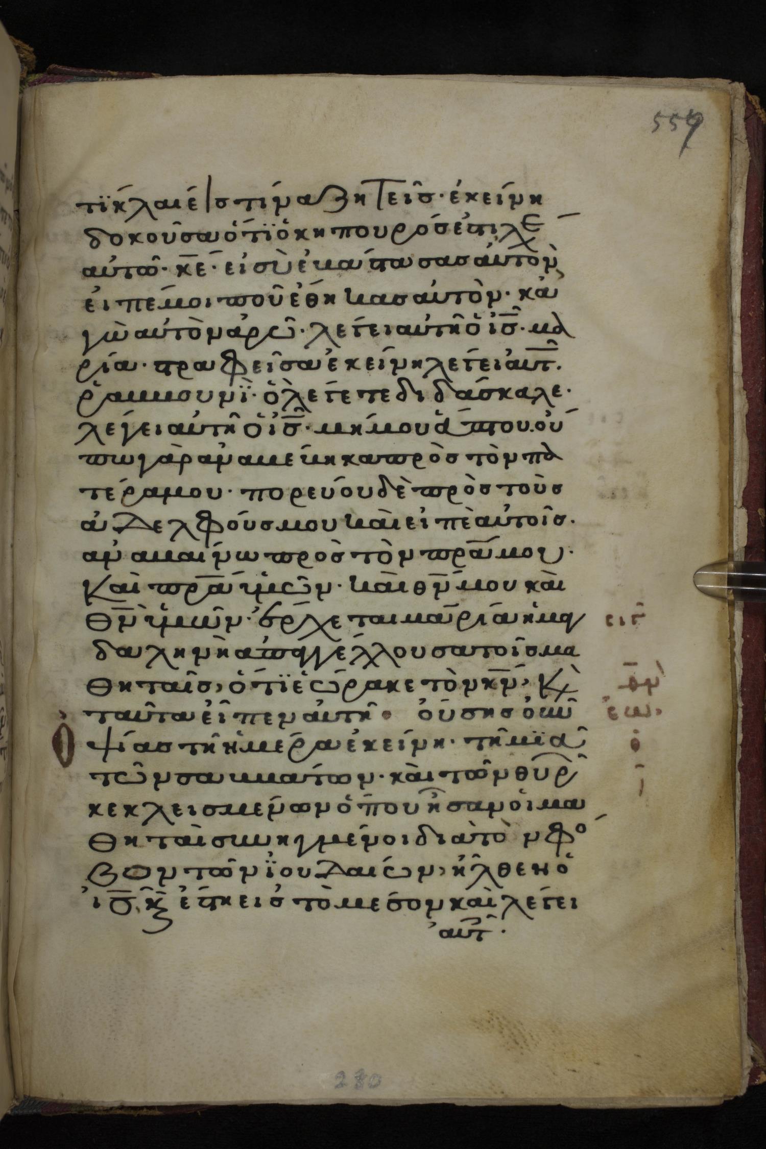 Twelfth century minuscule of the Gospels on parchment; 285 leaves, 1 column, 21-23 lines per column. Images were taken at the National Library of Greece in Athens.