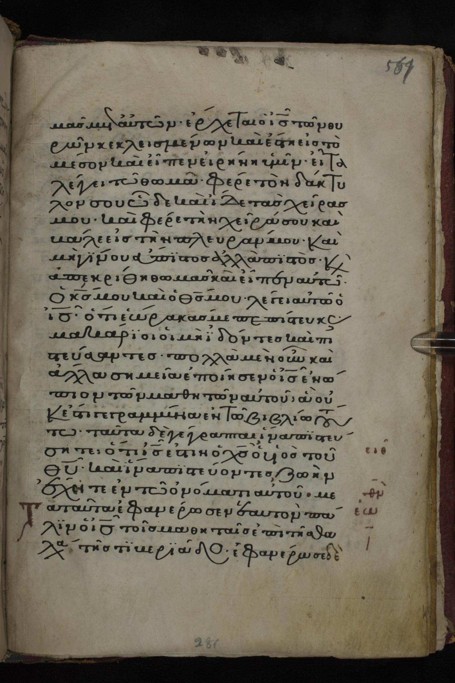 Twelfth century minuscule of the Gospels on parchment; 285 leaves, 1 column, 21-23 lines per column. Images were taken at the National Library of Greece in Athens.