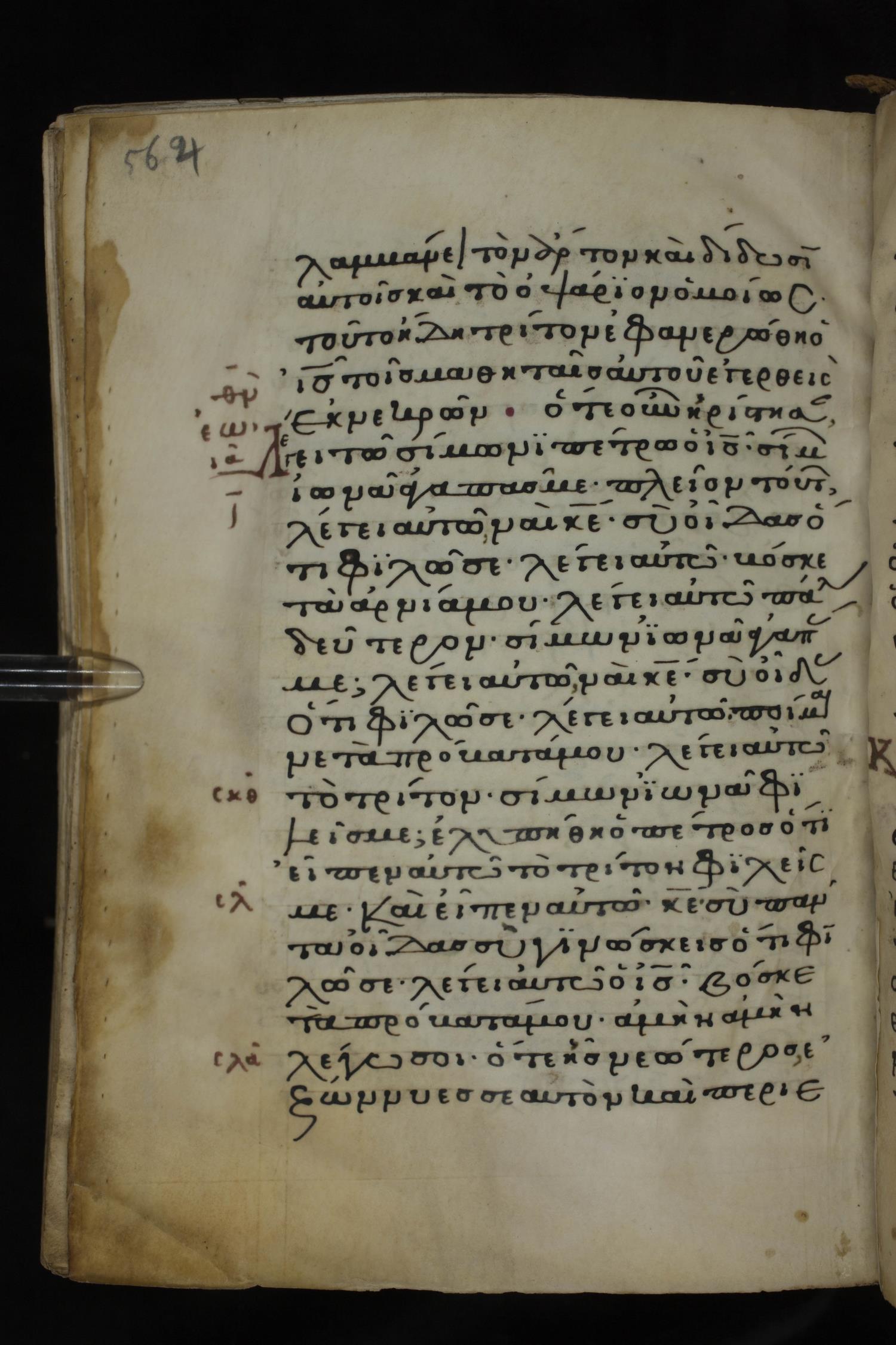 Twelfth century minuscule of the Gospels on parchment; 285 leaves, 1 column, 21-23 lines per column. Images were taken at the National Library of Greece in Athens.