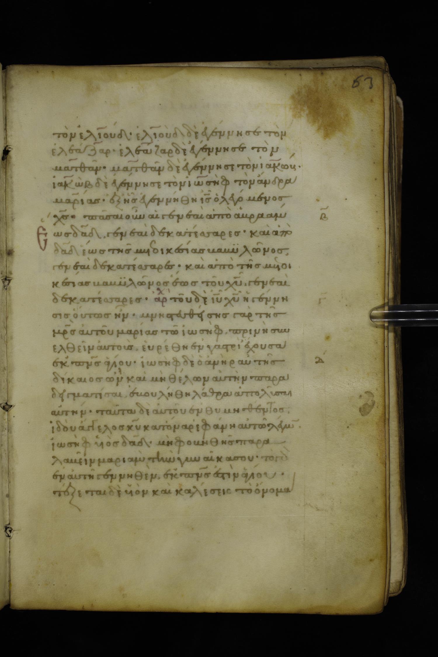 Fourteenth century minuscule of the Gospels on parchment; 282 leaves, 1 column, 22-23 lines per column. Images were taken at the National Library of Greece in Athens.