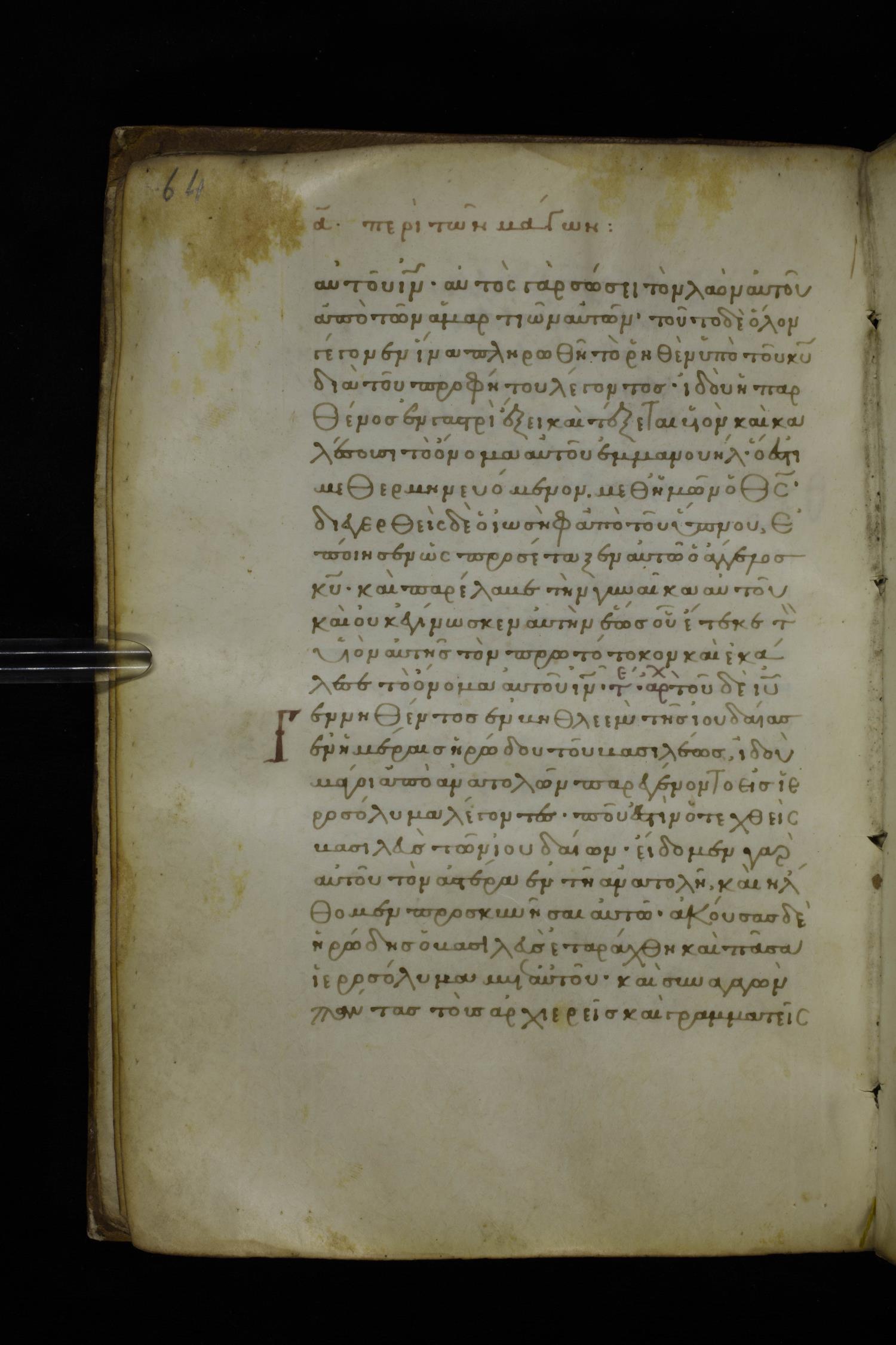 Fourteenth century minuscule of the Gospels on parchment; 282 leaves, 1 column, 22-23 lines per column. Images were taken at the National Library of Greece in Athens.