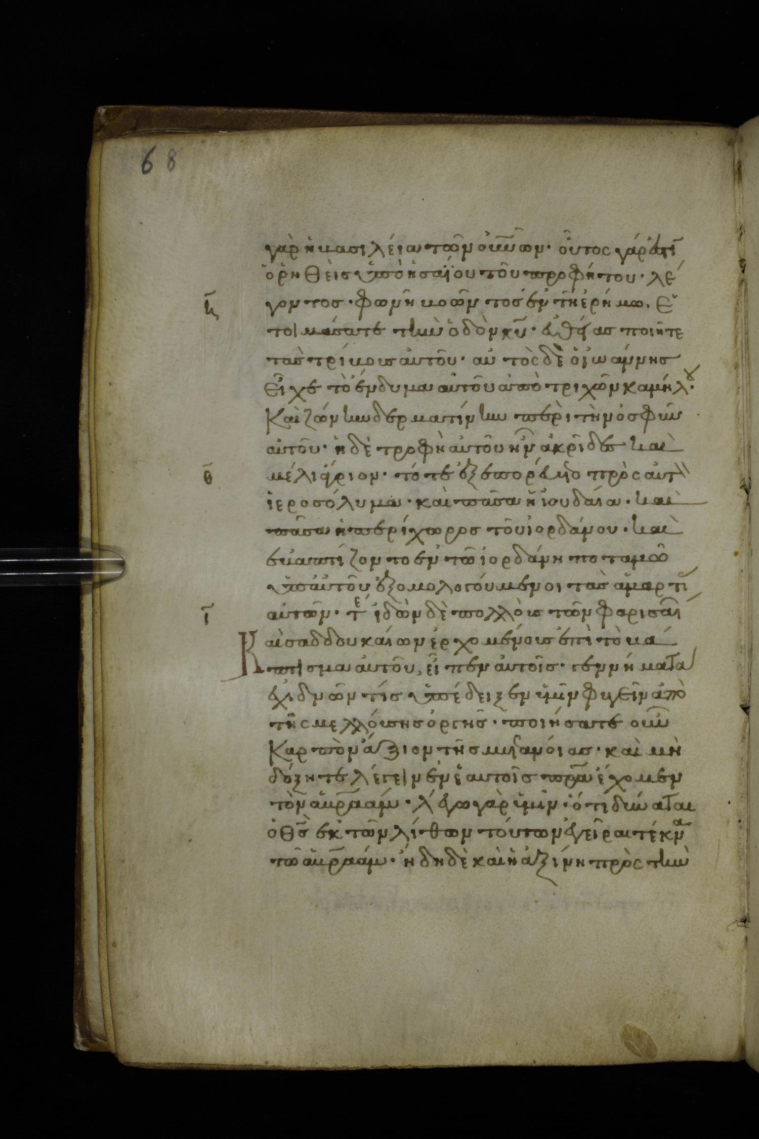 Fourteenth century minuscule of the Gospels on parchment; 282 leaves, 1 column, 22-23 lines per column. Images were taken at the National Library of Greece in Athens.