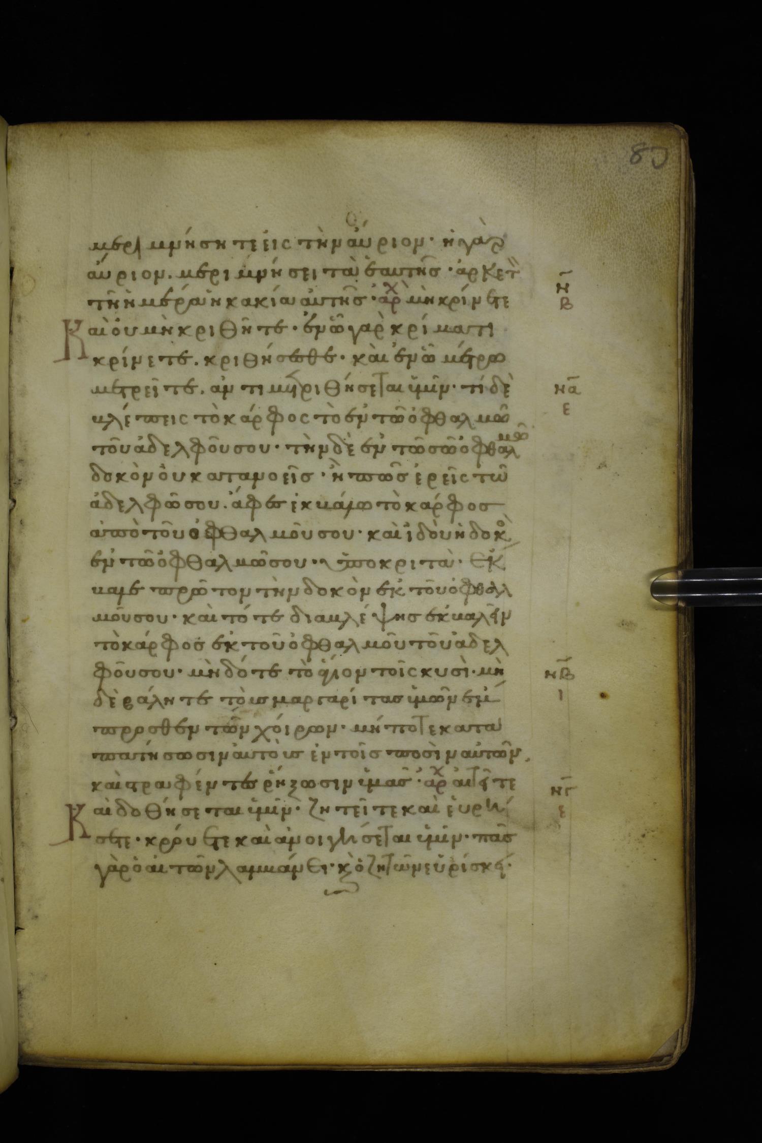 Fourteenth century minuscule of the Gospels on parchment; 282 leaves, 1 column, 22-23 lines per column. Images were taken at the National Library of Greece in Athens.