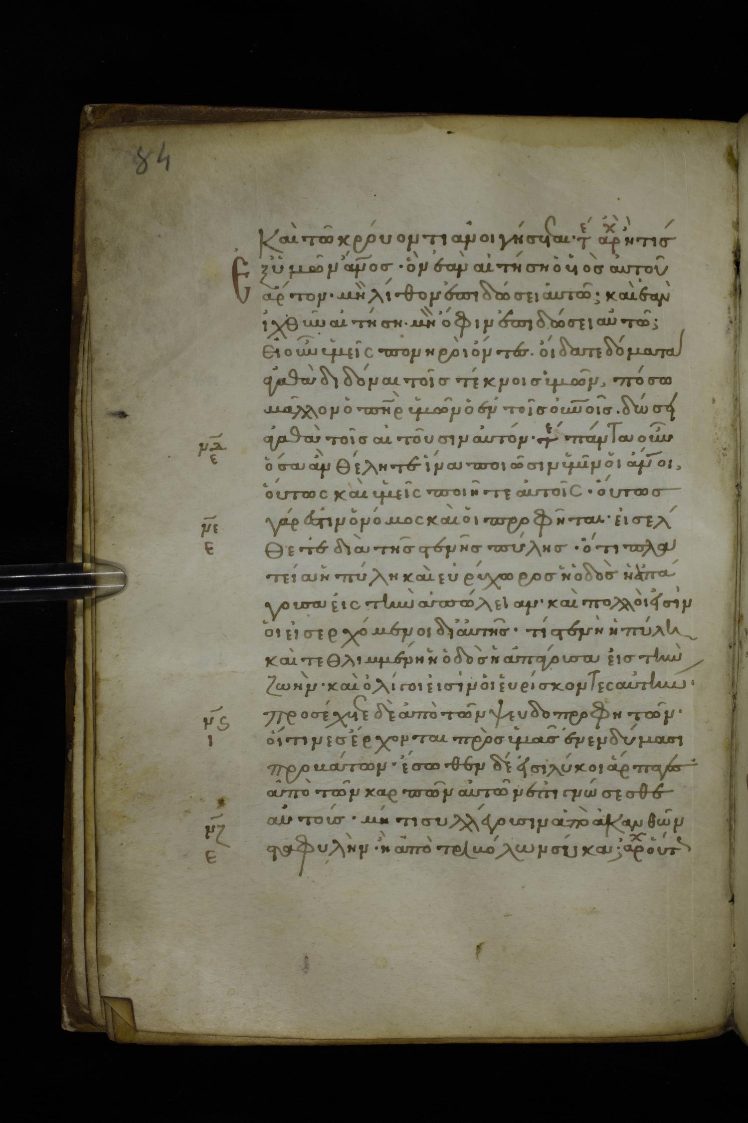 Fourteenth century minuscule of the Gospels on parchment; 282 leaves, 1 column, 22-23 lines per column. Images were taken at the National Library of Greece in Athens.