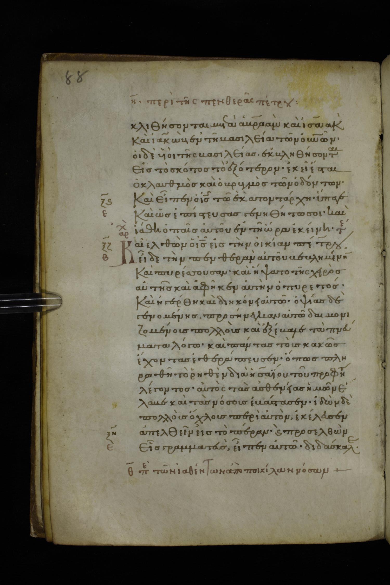 Fourteenth century minuscule of the Gospels on parchment; 282 leaves, 1 column, 22-23 lines per column. Images were taken at the National Library of Greece in Athens.